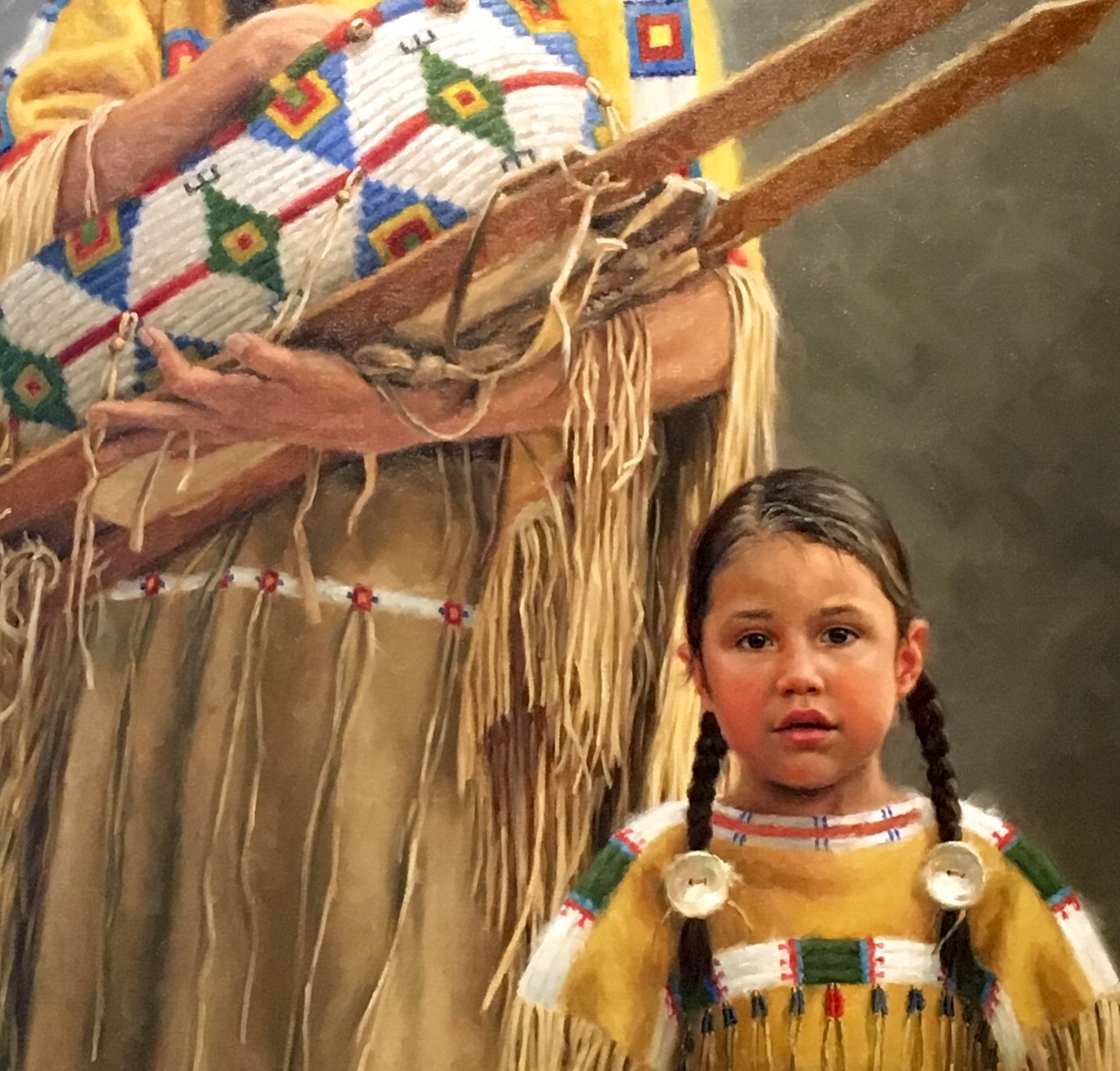 The face of this young Indian girl haunted me from across the Booth Western Museum (boothmuseum.org)…and I mean that in the best sense of the word. This oil on Belgian Linen by Krystii Melaine titled Mehohta-Love begs us to see the face of the next generation and understand the incredible heritage she will bring to the world. Here you see her in front of her mother who is holding a sibling in her arms. No matter the culture or country, the language or location all mothers adore their children.