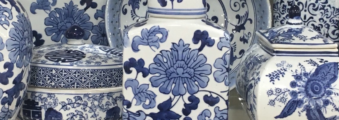 About thirty years ago, blue and white were the decorating colors of choice. Every magazine, furniture store, and paint store featured the colors blue and white. Catalogs for furniture stores and decorating locations were filled with rooms flooded with blue and white. As you know decorating trends change, color palettes come and go. I found this display in a decorating store and realized that blue and white is back.