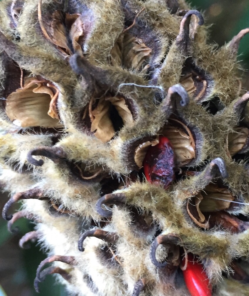 We were at a friend’s house yesterday walking around the yard. There was a magnificent magnolia tree with ‘spent’ buds. Here is a close up shot. At first I thought it looked a little alien, or like something from a horror film…and yet, the small red element reminded me that at one time it was full of life and a cherished symbol. Many southern homes use magnolia leaves to decorate. They use them in wreaths, garlands around doors and in floral arrangements. I had to remind myself that just because it was ‘spent’ the beauty was not gone.