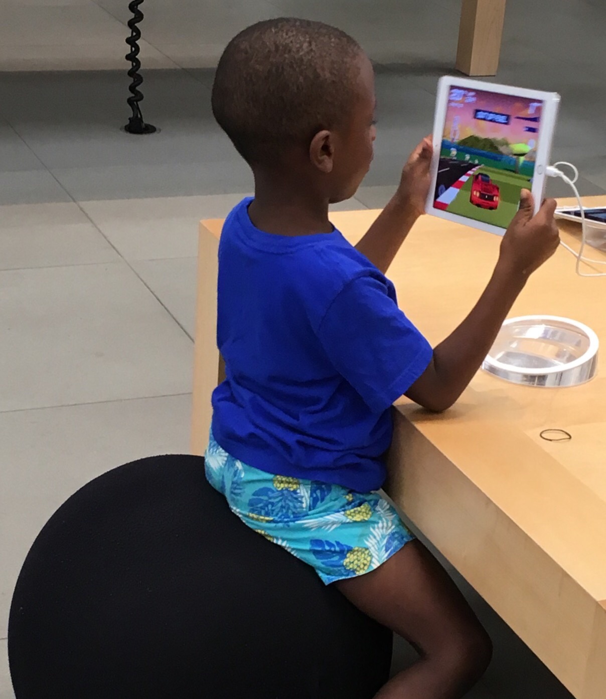 When we were shopping at the computer store, this little fellow was passing the time playing a game. I watched him sit down, pick up the computer and start the game…no assistance needed. He sat there for almost an hour without talking to anyone while his family was moving around the store shopping. He exhibited no fear, no anxiety. And he only showed frustration when he could not succeed at the game. What did he do? He talked to the little boy on the other side of the table. Together they figured it out.