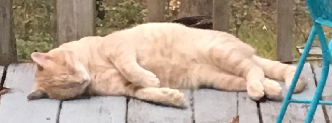 For the last six months this friendly fellow has been visiting our house. It took me many months for him to let me pet him. Of course I bribed him with food and water. We didn’t know what gender he was until we saw him from behind – boy! So we have named him Persimmon. Now, this is how we often find him on our back porch after he has finished snacking. He will stay there for hours, hours, and hours.