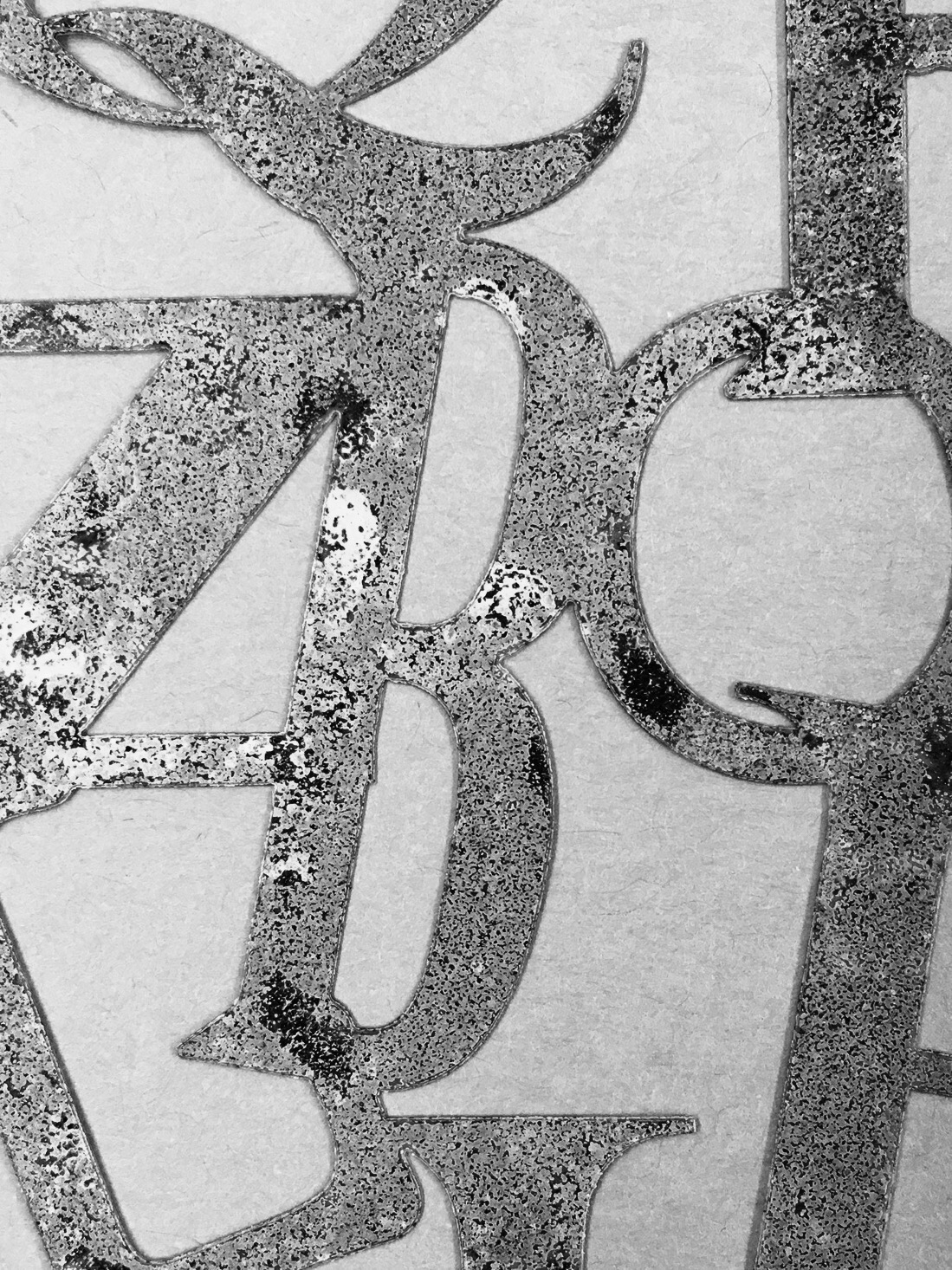 I love letters, in all forms, sizes, shapes and colors. Here you see the leftover paint on a letter collage stencil my friend shared with me last weekend. I used it to create some cool layers and color combinations. I look forward to using my new creations in artwork in the future.