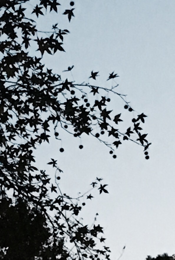 It was a full moon last night. When we stopped to look in the sky my husband commented that the leaves on the trees looked like stars in the sky. This view also makes me think about how we decorate Christmas trees with ornaments and garland. Those ornaments look very much like the sweet gum pods hanging off this tree. Here real life reflects the beauty in nature.