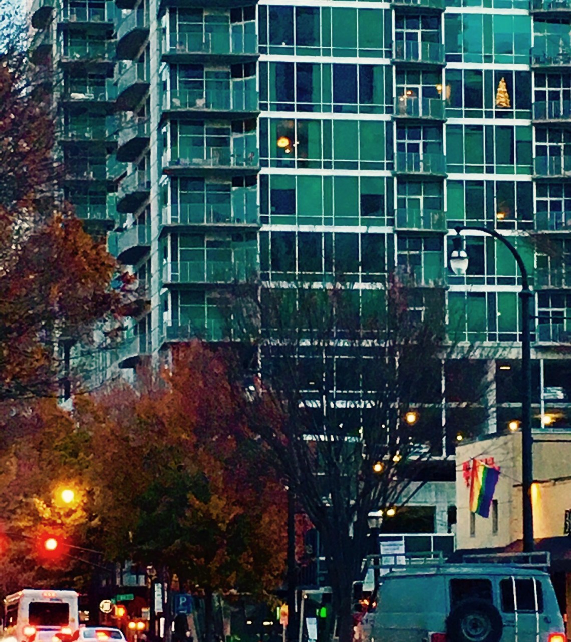In the hustle and bustle of city life, even here it is Christmas. I spotted the Christmas tree in the apartment window in this building. It made me smile. I live in a rural area over sixty mile from where this shot was taken. Even I could relate to the city dweller who decorated their tree and put it in the window for all to see. I knew my tree at home would be lit up and waiting to greet me when I arrived. Our tree is on a timer, so the lights shine bright once it gets dark. As I walked down the street I knew that the joy and peace of Christmas was alive and well no matter where you live. City and country are not so different, we both put our trees up for all to share in the wonder.