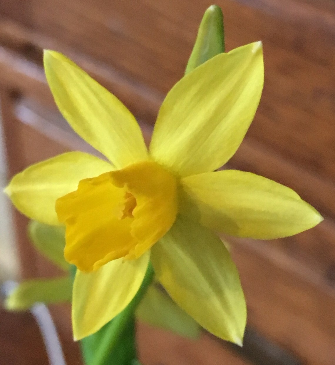 We may get snow this weekend. We live in Georgia so this is quite exciting and winterie at the same time. It will be our first chance for snow this Winter, and maybe our last. I find this weather update ironic as today my Mom’s Daffodils bloomed. I know we still have several more months of winter. The days are still dark very early, and the sun rises rather late. So the darkness can seem endless and the long nights move by v e r y, v e r y slowly. Sometimes I am tired and want to go to bed, check the time and it is only 5:30…ugh! This time of year seems to lag on forever leaving us feeling drab and dull. When I saw this flower blooming in all this dullness and darkness it gave me hope.