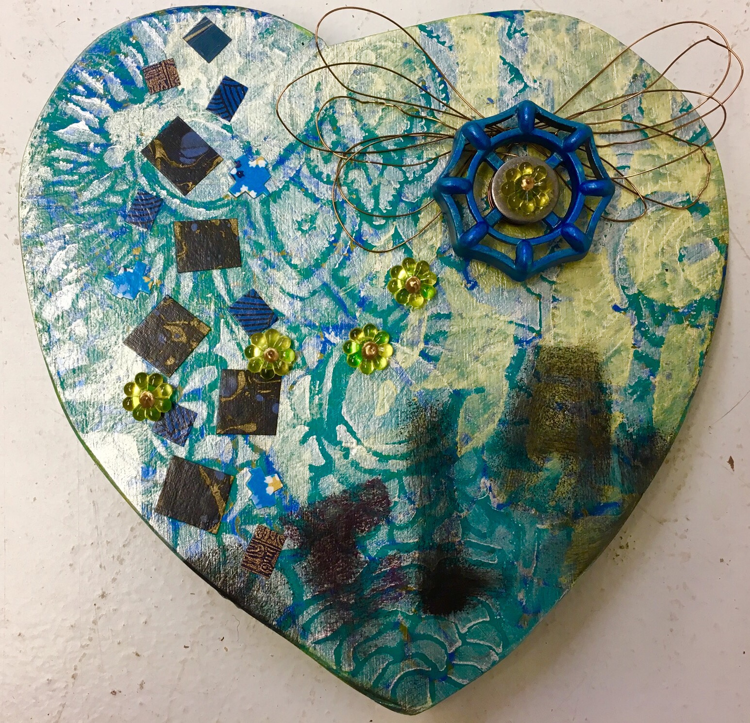 I finished a heart which I started last month. I worked on it last weekend and thought I botched it. I put too many layers of paint on it and had no idea how to proceed. As I was out of town for the rest of the week, I thought about what I might need to do to get it back to the image in my head. I must admit I was discouraged and had no idea how to proceed.