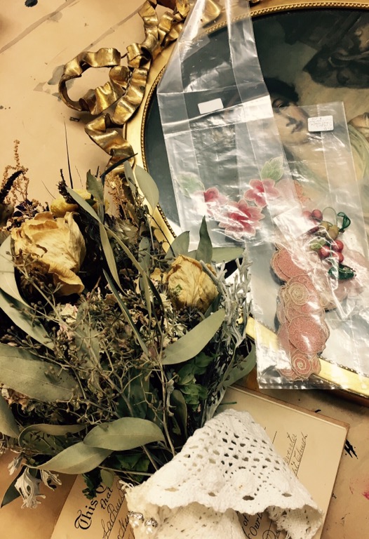 I am the one who has the challenge of making all this memorabilia a family heirloom. This one is WAY out of my comfort zone. I have never worked with an oval frame or mat. I have little or no experience working with dried flowers. I have never created a Victorian looking piece, and antique lace has never been incorporated into any of my work. So why in the world would this client come to me to create something? She has brought my work before and enjoys seeing it every day. She has been in my studio on numerous occasions, so she understands the creativity that pours out of our space. She was excited to bring me her treasures to see what I could create.
