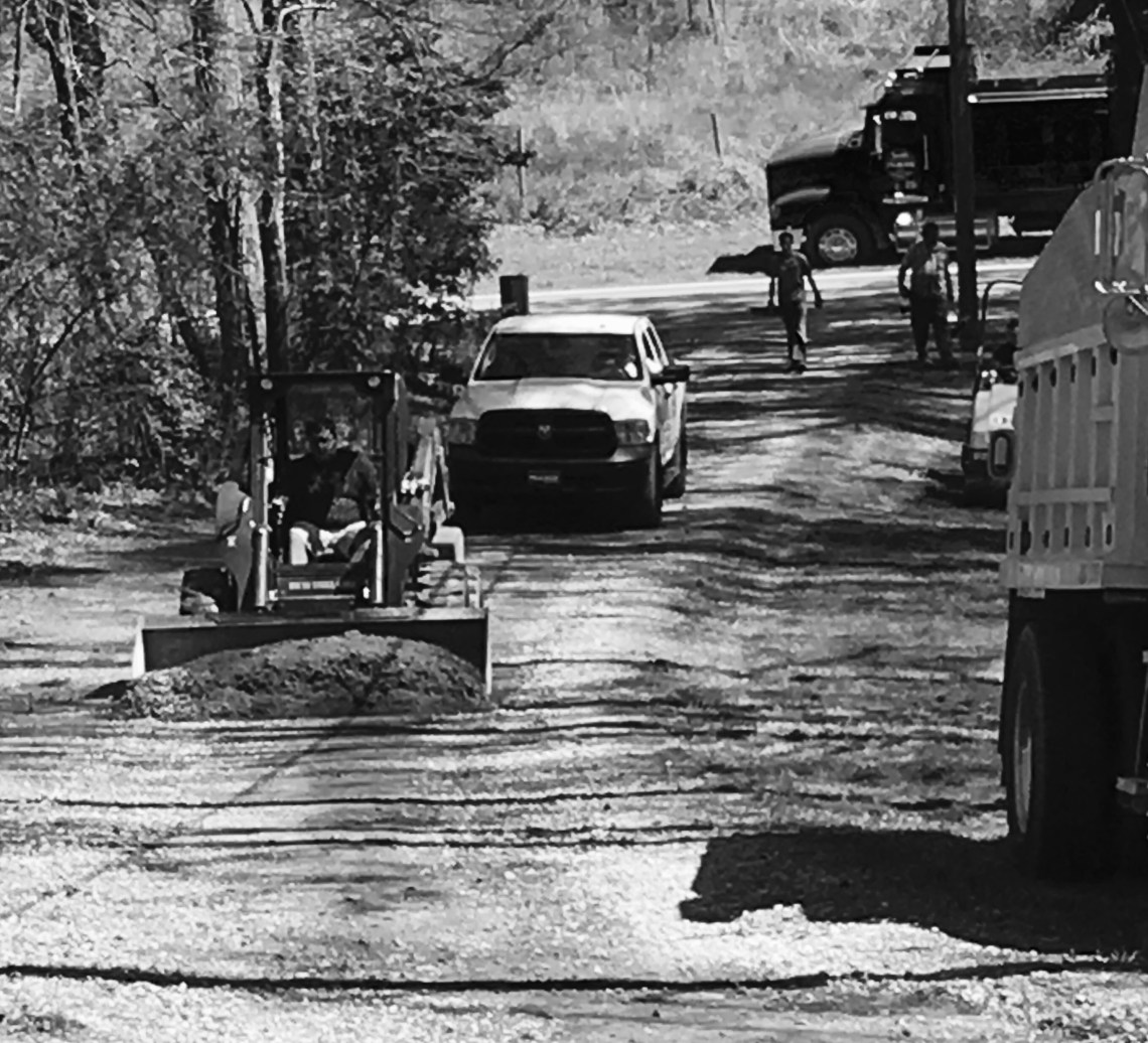 We live in a small town, and we like. Today we were reminded why we enjoy living where we live. Benny dropped by. Actually he pulled up in his shiny, white pick up truck and starting talking to my husband. Next thing I know they were both walking over to me. I heard them say, “Gotta talk to the wife.” Long story short, Benny resurfaces ‘country’ driveways. He grades them, then uses a steam roller to level it all out. Then hot tar is poured all over the space, then covered with small gravel. He had been working on a job near us, and had leftovers. He noticed our beat up gravel drive and wondered if we would be interested in him finishing his day by resurfacing our driveway. Fifteen minutes later his crew of nine arrived and started the process. Within one hour they were done, it looked great, and we were more than satisfied with the end result.