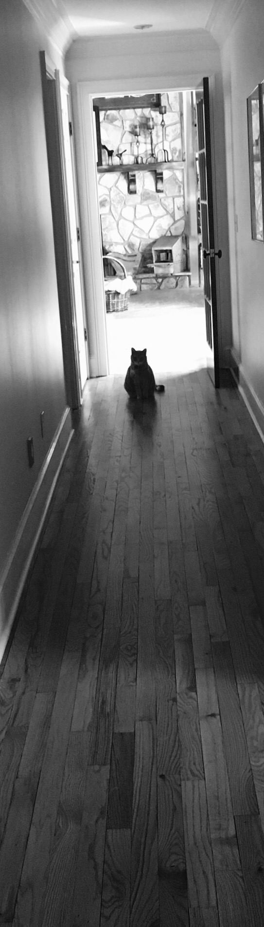 All too often when we get home, there is a feline waiting for us. Here our older cat Gabbi sits waiting at the end of the hall, wondering when we will go near the treat jar. I know somewhere in her cat-ness she is glad we are home; I also know she simply wants more food and we are the food providers. Most days I choose the romantic view of things and believe she misses us as part of her ‘herd’. She is glad to see us and have us back safe and sound.