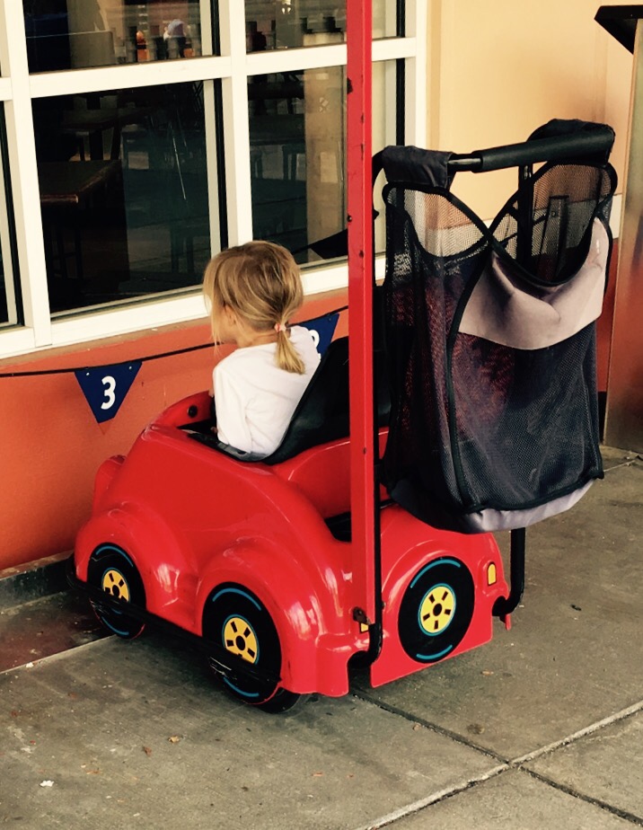 Discipline your kid at the Mall. Yes, it can be done tactfully, and this little girl proves it. Today when we were walking around an outdoor mall, I spotted this kid siiting by herself. She was actually watching her family who were sitting next to the window in the food court. They were still eating, and I noticed her grandmother sitting on a bench nearby…ignoring the child in solidarity with the others. The little girl was trying to rock her time out vehicle back and forth to no avail. She kept looking at the window, looking at grandma, then back again. No one was paying any attention to her. I silently applauded the parents who had won this battle.