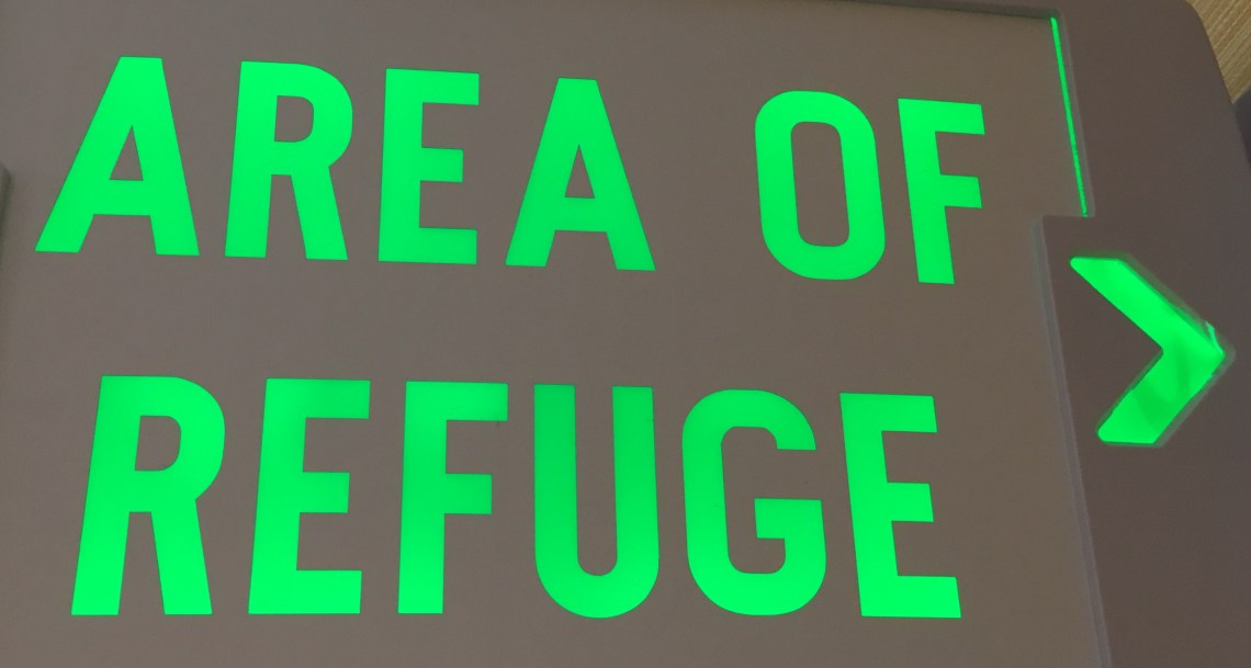 I saw this sign for the first time this week. It was in the hotel where I stayed at the end of the floor. I checked it out and in the case of a weather event it is where people in wheel chairs or with mobility issues go to be safe during the storm. I had never heard a safety area called an ‘area of refuge’ and yet the name truthfully applies.