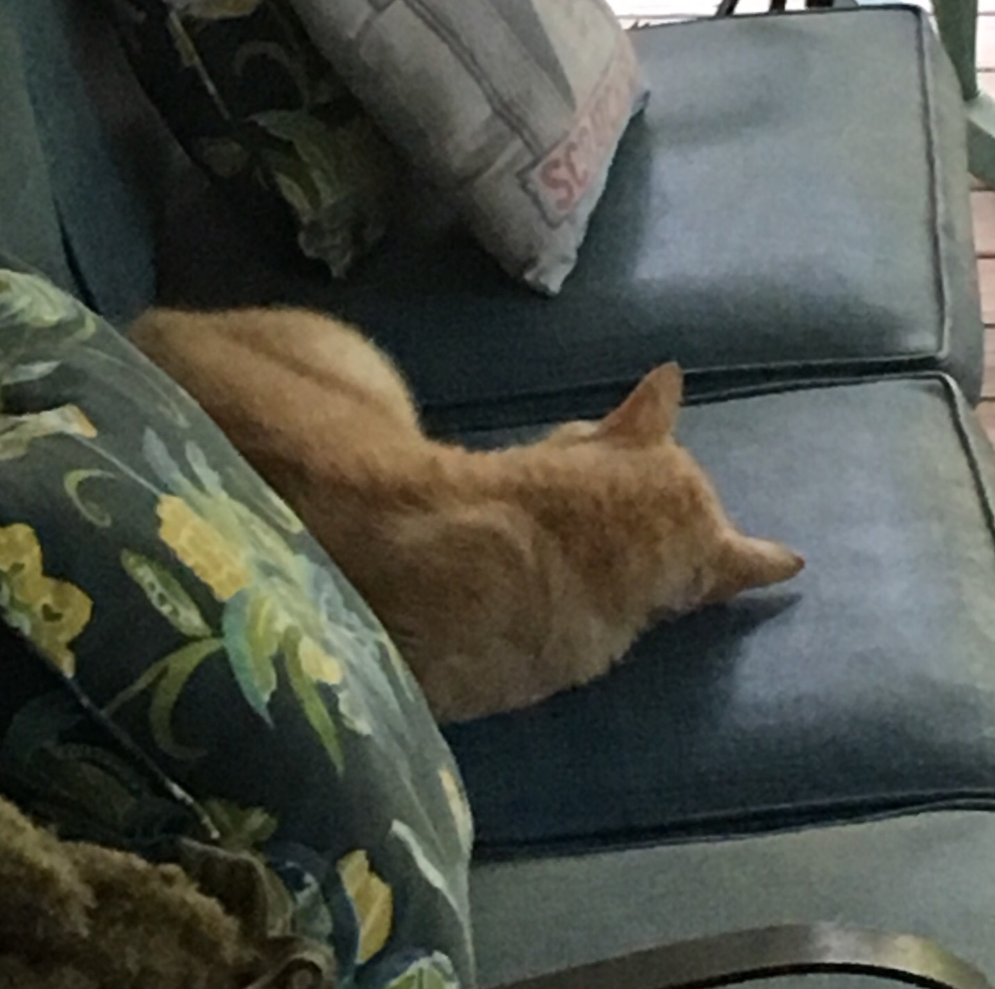 Persimmon has moved his napping place to the sofa on our front porch. I have found him there sleeping several times in the last week. He is the stray cat who has adopted us over the last year. Let’s face it, he has trained us to his way of working more than we have assimilated him into our lifestyle.