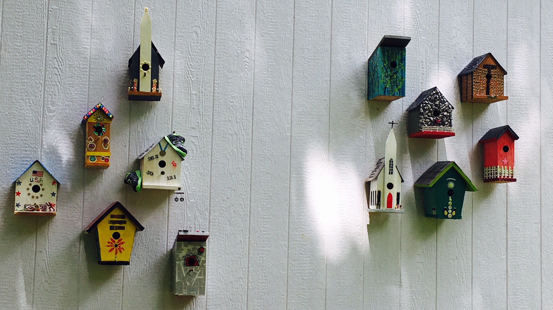 We have a storage shed in our yard that is white and very utilitarian. The last time our family visited we all built bird houses so we could cover one side of the shed. We spent a rainy day painting, glueing and decorating each one. As you can see no two are alike. Each person put a piece of their own perspective into their house. We used hotel room keys and buttons, coins and license plates to cover the roof. We used glitter, paper, book pages and paint to cover the outsides. My brother runs marathons, so we screwed running shoes to his house. My niece covered one with rocks from the driveway, and another with flowers. The homage to military service has Army men guarding the front porch. We plan to name this area and create a bigger house in the center of all the others to serve as the ‘community center’. We completed twleve, and already have different ones in process. We hope that when others visit they will want to decorate a bird house so they can put their stamp on our shed.