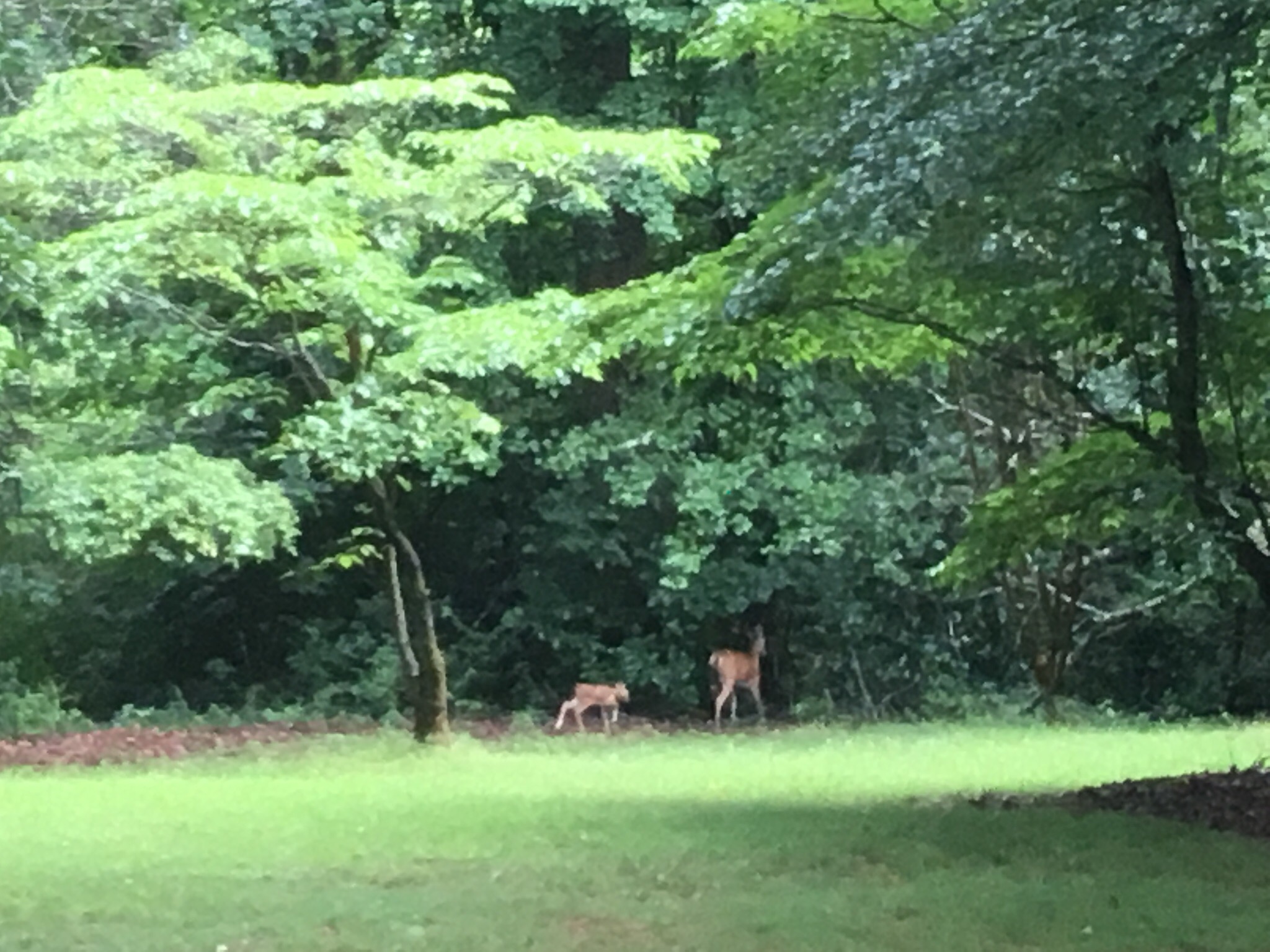 My husband and I were commenting that we had not seen many deer on our property, and almost as if on que this Mama and baby ran through our yard. They stopped and nibbled some of the violets, then got nervous as they heard us talking about them. The newborn had a hard time keeping up with it’s mother, so she slowed down then walked behind the fowl to make sure it knew how to get back into the forest. The baby was so new it still had it’s spots, gangly legs and akward gate as it walked.