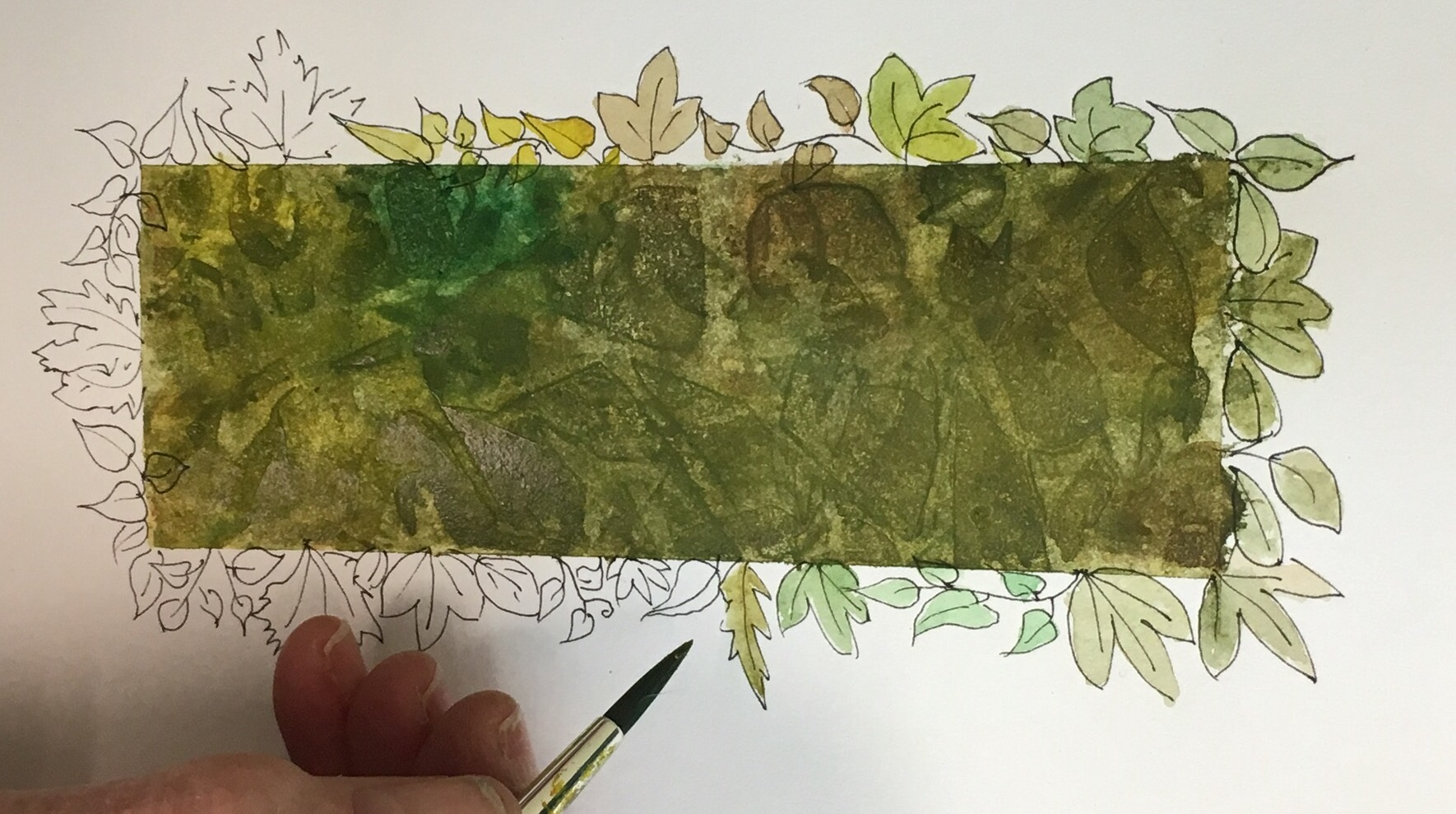 I saw Penelope creating this beautiful piece, so I stopped and asked her about it. She told me that she created the wash inside with her watercolors, and it flowed outside of the lines. She wanted a clean green box, so she was disappointed. It did not turn out the way she wanted. She set it side for a while, then when she got back to it she had an idea. She painted the leaves around the edge, which utilized in her mind what was her original ‘mistake’. I thought that was a brilliant way to turn what she didn’t like into a happy accident. Without that ‘mistake’ she would never have created such a beautiful work of art.
