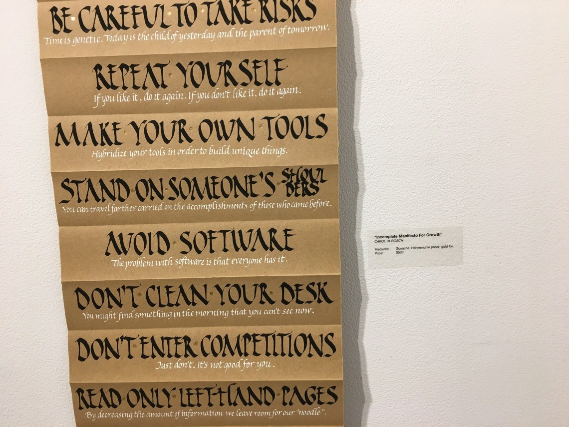 This piece called ‘Imcomplete Manifesto for Growth’ by Carol Dubosch highlights what can be done with paper and ink. She has created a floor to ceiling list of ideas to live by, then elaborated in a smaller script the meaning behind each statement. Not only are the lettering and creativity amazing, the words provide great insights into what the artist believes.