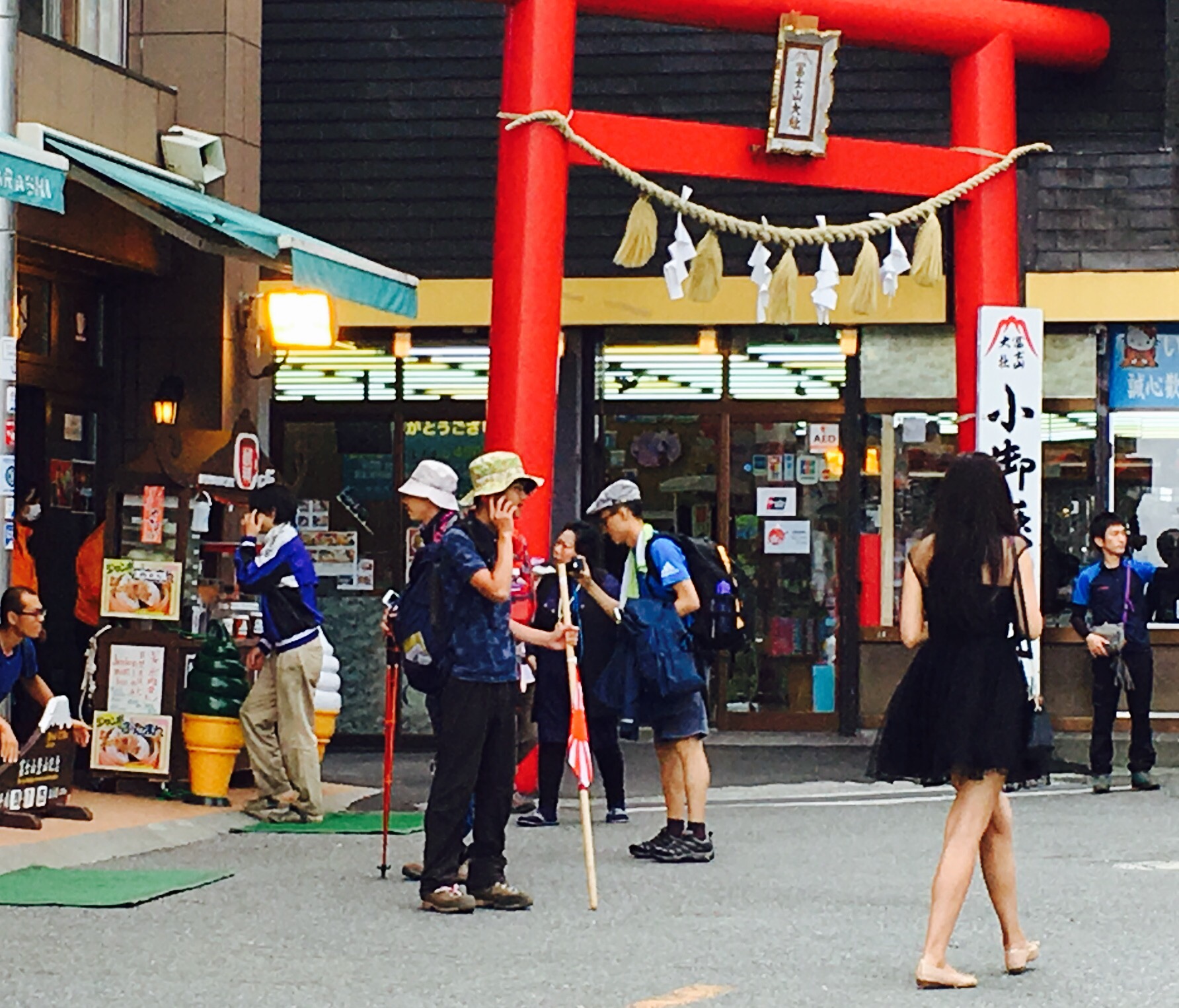 At the staging area for Mt Fuji there are many types of people. There are the climbers getting ready to ascend, and the climbers who have just come back from the rugged mountain trails. There are bicyclists who have biked into the space, and tourist buses full or sight seeers. As I was getting my strength back from having finished our climb, I was people watching. The young woman wearing the pretty black dress, fashion accessories and stylish hair caught my eye. She seemed to be out of place with all the hikers and outdoorsy types. Yet she was walking full of confidence and enjoying the area just like everyone else.