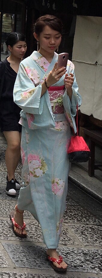 I love seeing young people who are living a life that balances the past and the present. This beautiful Japanese woman is wearing a Yukata, a cotton kimono traditionally worn in warm weather. She looks elegant and cool on a humid and muggy day. I am impressed that even her cell phone is color coordinated with her outfit. She is a wonderful representation of the beauties of Japan and how they balance the ancient with the modern. Instead of forgetting their past they embrace it and bring it into the current century.