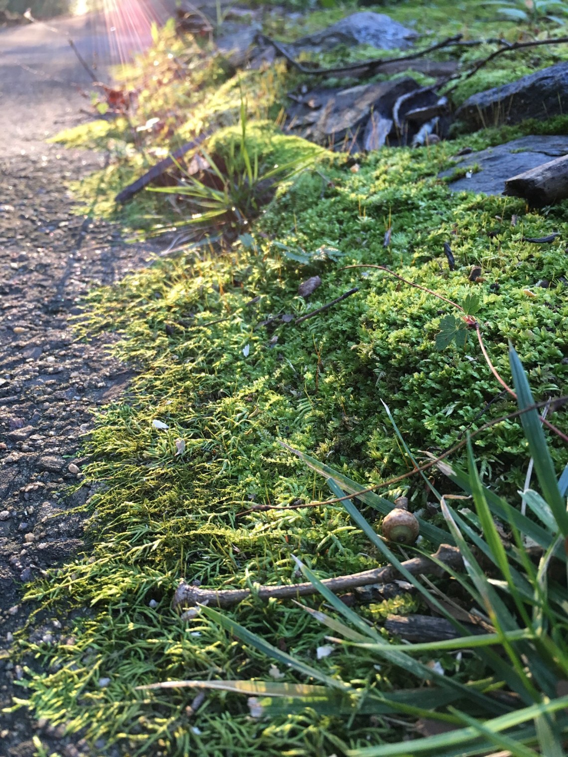 The light was very beautiful the other morning, and I was able to catch it as it woke up some moss on our path. The closer I got the more the light brought out the amazing shades of green. It also highlighted all the weeds, the twigs, the random acorns and dead leaves strewn about. You can see the wild strawberries peeping out and slowly stretching across the moss. The light put on an incredible show, then moved on to get the day in full bloom.