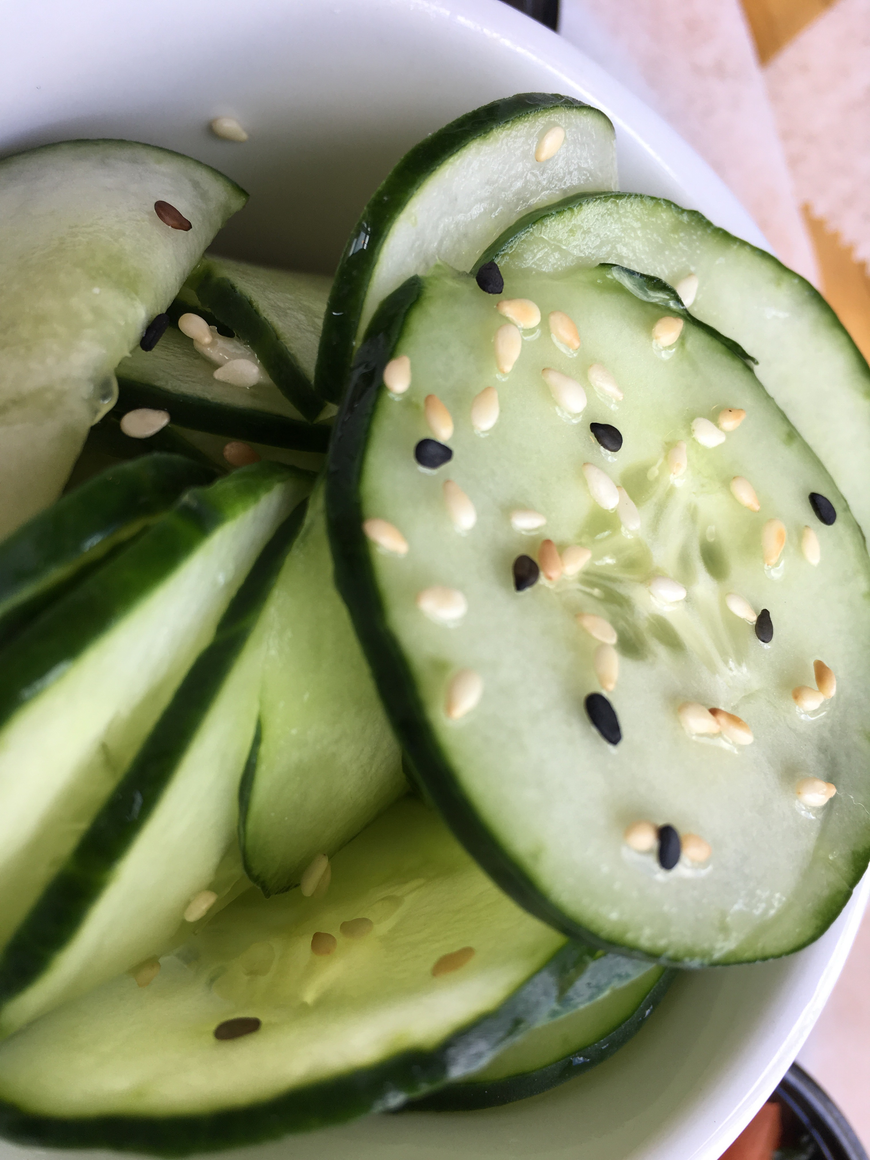 My husband is a foodie. He loves eating new things and trying different kinds of food. I am not a foodie. I have a plain palette and I like to know what I am eating. You can imagine the challenges this difference may create. There are times when we greatly agree on something good. Cucumber salad with sesame seeds is one of those times. When we order it we know exactly what it is going to taste like. When it arrives it is like seeing an old friend arrive in a ramekin; it is just what we wanted.