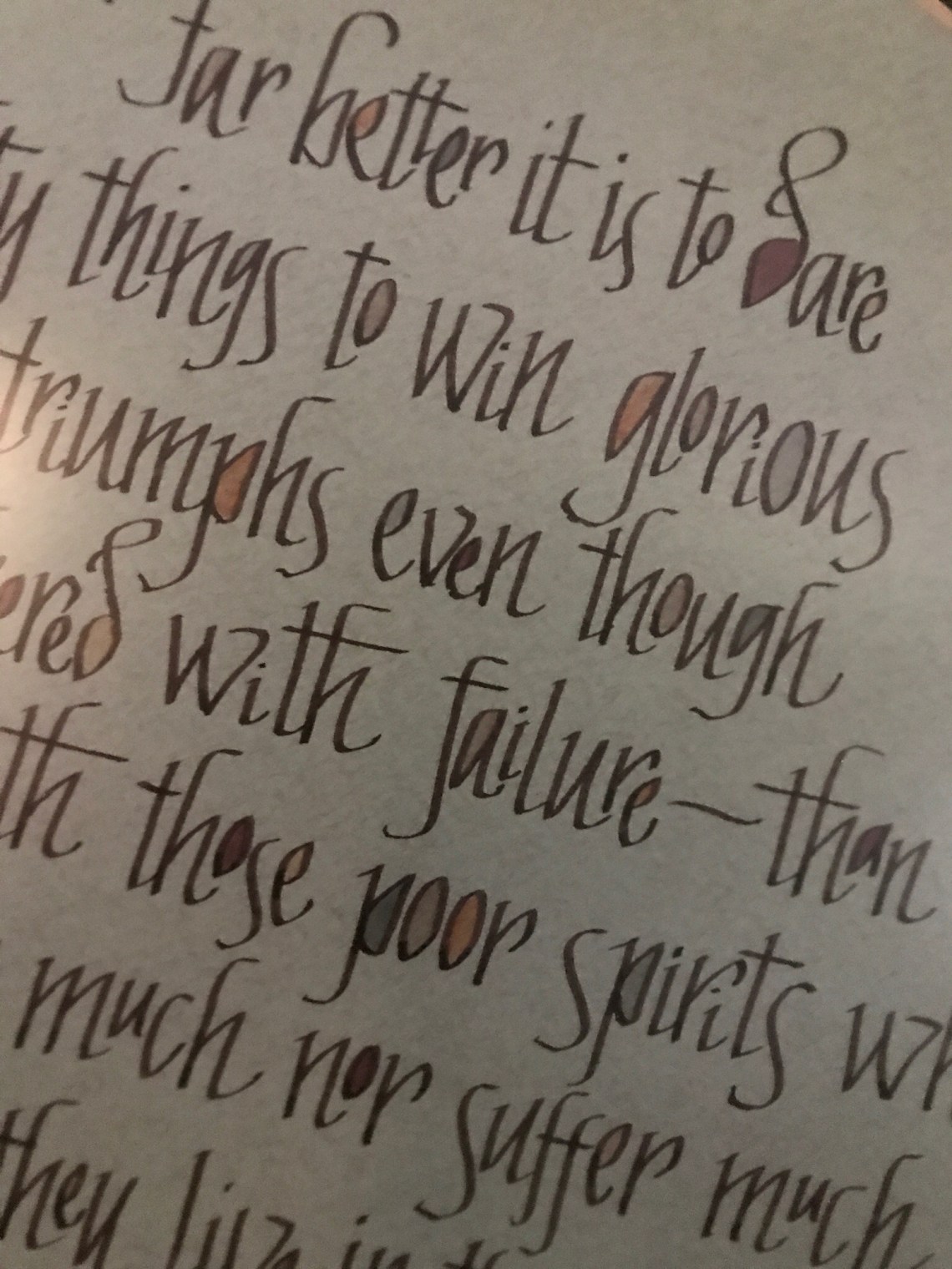 My first calligraphy teacher gave me a piece of advice at the end of class once we had produced our first real piece. He told us that no matter how awful we think this piece of work is, always keep it. Then when you doubt your skills and abilities you can look back on your very first piece and see how much your work has grown. I took his advice and have kept my first awful work in a flat file drawer. Over the decades I have looked at it to remind myself of what he said, my work has progressed and I am not as bad as I used to be.