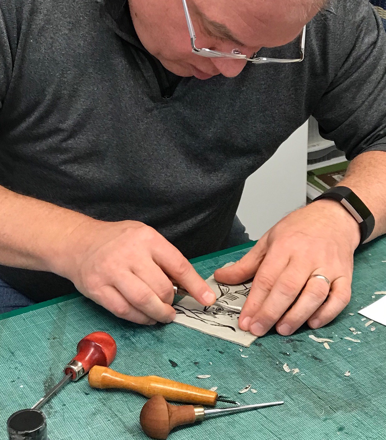 After the Thanksgiving leftovers, after the football game naps, after the house clean up there is time to create. My husband is carving a new linoleum block of a goldfish. He printed several and played with adding watercolor and colored pencil. As they dry overnight, he already has things he wants to develop even more.