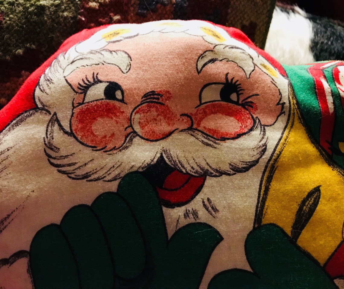 When I was growing up we had Santa pillows around the house. Like this one, they were made by sewing together a preprinted design and then stuffing it with pillow filler. This Santa has been with me since I was a child. He and his wife have graced my bed or other rooms of the house, filling the place with Christmas spirit and hope. Every year I enjoy bringing them back into the house to spread a little Christmas cheer.