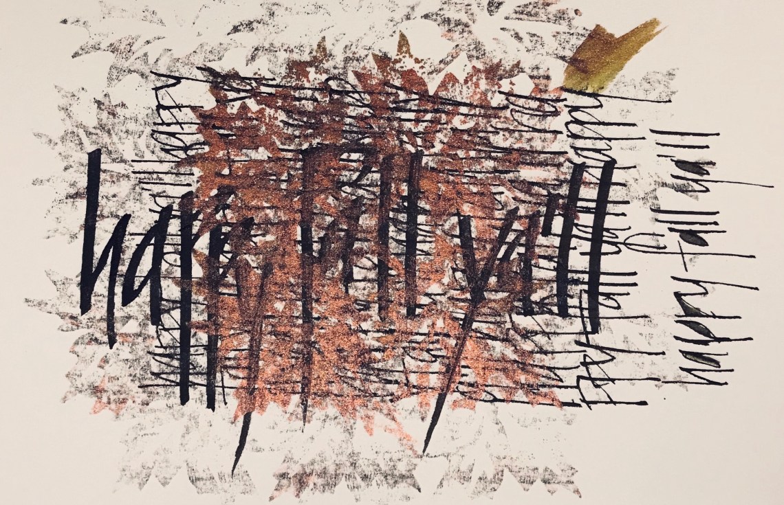 This week’s calligraphy prompt was to celebrate autumn. I spent time this week making wooden stamps and decided to play with those for the challenge. I used black ink to create a pattern with the words ‘ happy fall ya’ll’ then turned the page and wrote the same phrase with a larger nib. I then used copper ink on one of my new stamps and smeared it on the page.