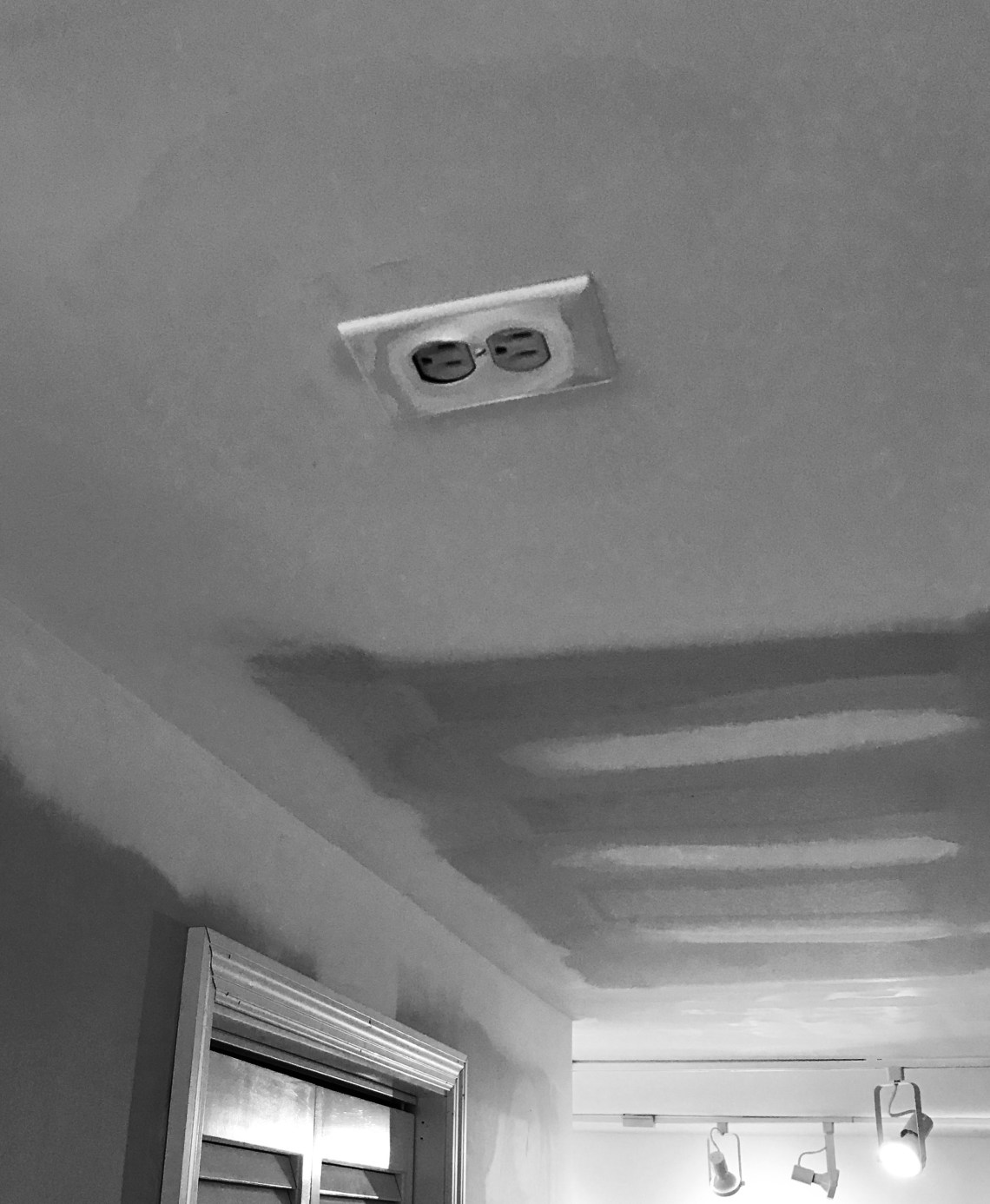 With the recent renovations we had completed, the electrician put an outlet in the ceiling. Not sure what he was thinking on that one. There was an outlet when this space was a closet, but who wants one in the ceiling in the middle of the room? We got a laugh out of it and have covered the outlet with a blank, white plate. It isn’t too noticeable and every time we see it we have a good story.