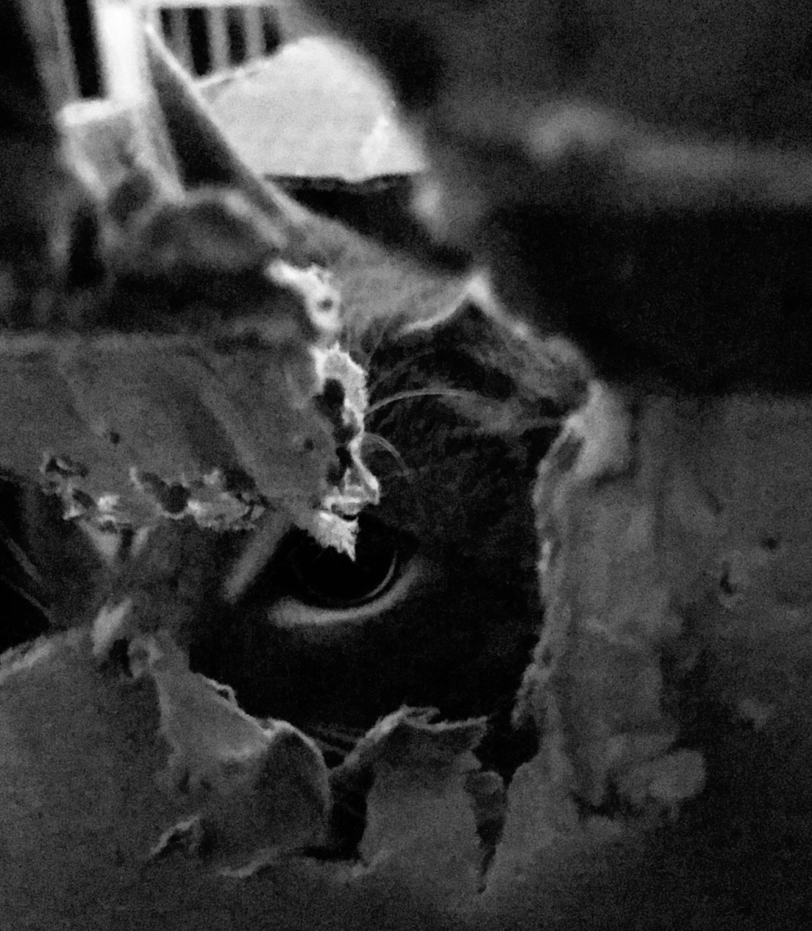 If you have pets or children, you know that the best toys on Christmas morning are the empty boxes. Our house is no exception to that rule. Our cat Artie loves boxes and has been playing in this one for months. He chews it, he plays in it, he sleeps in it, and he loves to jump in and out taunting his feline brother and me. This beat up box is the best toy he has, no matter what we have purchased at any store. Here you can see him playing tag with me by peaking through a hole he made in the side.