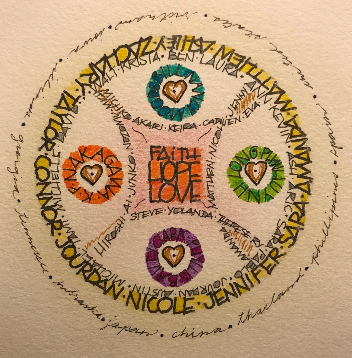 Our calligraphy prompt for this week was to create something that illustrates what anchors you in your life. I was facilitating a program all week, and the conference center had dated but interesting carpet. I thought a great deal about the carpet and the prompt and came up with this graphic version. It includes the names of our parents and family from across the globe. I used Copic .7, .05, .25 and .35 with Stabilo markers and colored pencils. It measures about four inches across.