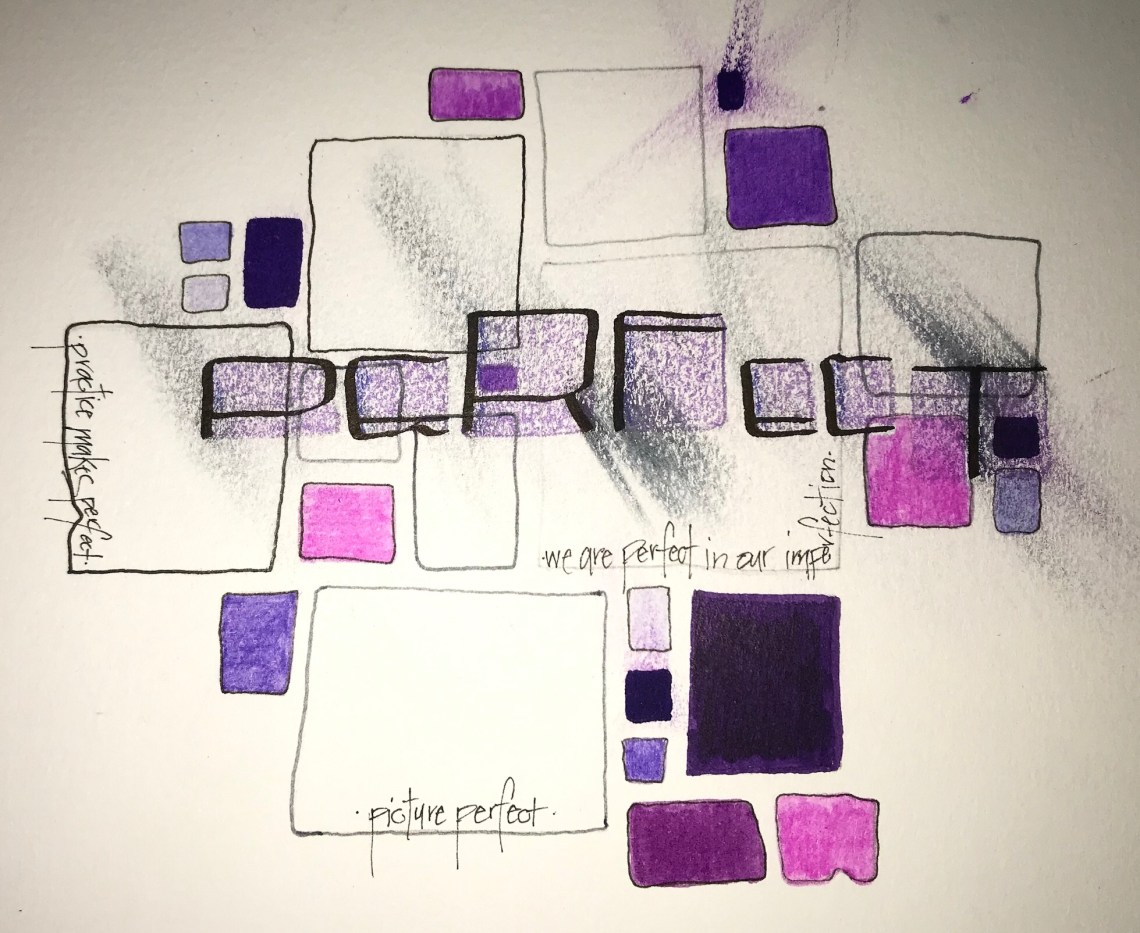 This week’s calligraphy prompt was to use a commonly know proverb and illustrate it in some creative way. I chose to do a proverb study on the word perfect. The three sayings – picture perfect, practice makes perfect, we are perfect in our imperfection – were my content choices. I decided to be as imperfect as possible, so I smudged the purple dot at the top. The black smears on the letters were an accident. Once I did the first black smudge with my finger I then had to make it work by smearing more letters, thus making it look intentional. It is not exactly what I had in my head and yet the idea works.