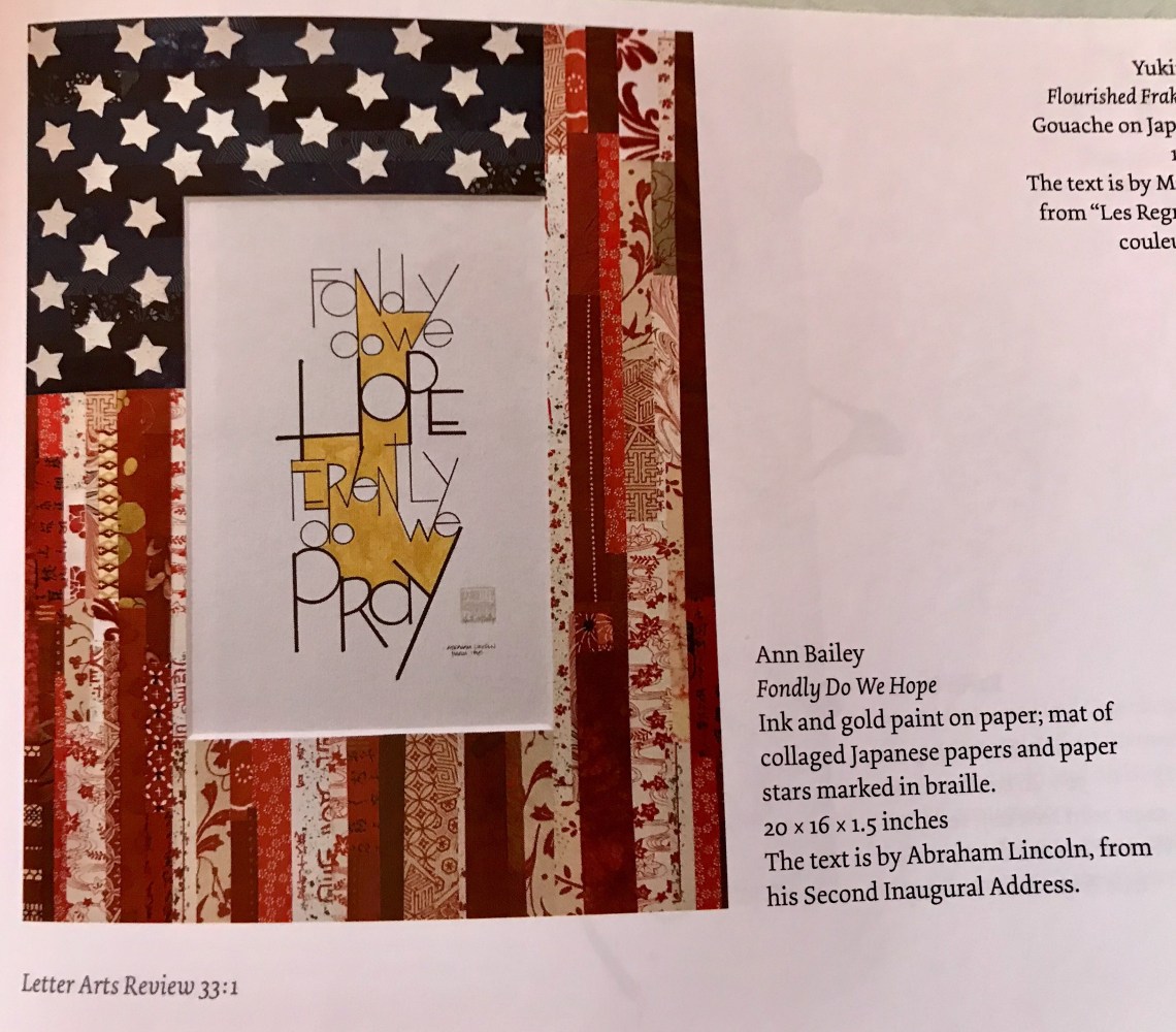 Many thanks to those who have supported me over the years. Thank you for your encouraging words and input, and for your enthusiasm. For me getting published in Letter Arts Review was a bucket list item, one of my top ten. Accomplishing this one only spurs me on to do more, create more, learn more, and not shy away from stepping out of my comfort zone.