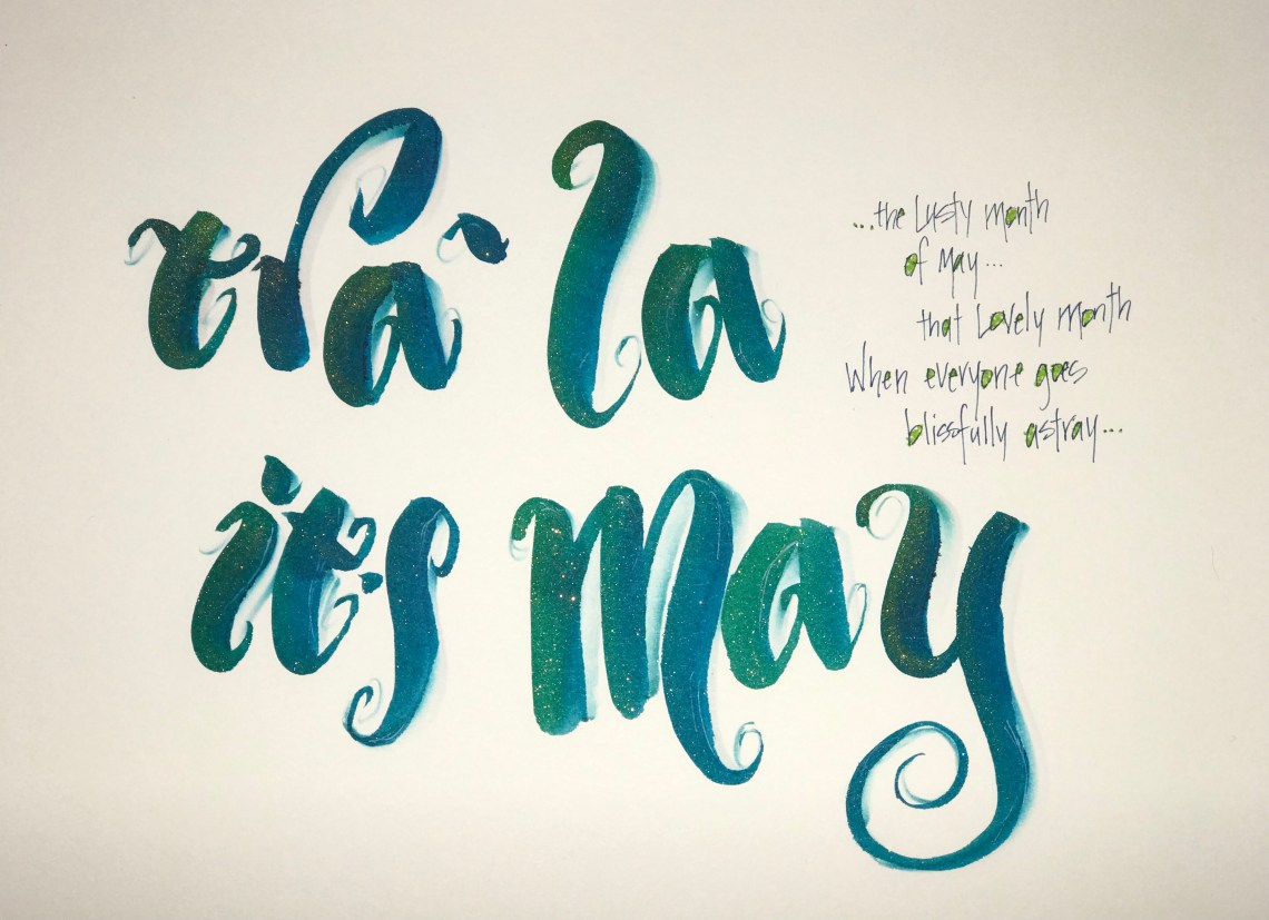 This week’s calligraphy prompt was to celebrate the month of May. The moment I read the prompt I could hear Julie Andrews singing the lyrics from Camelot about “the lusty month of May”. I knew I had to do something around those words.
