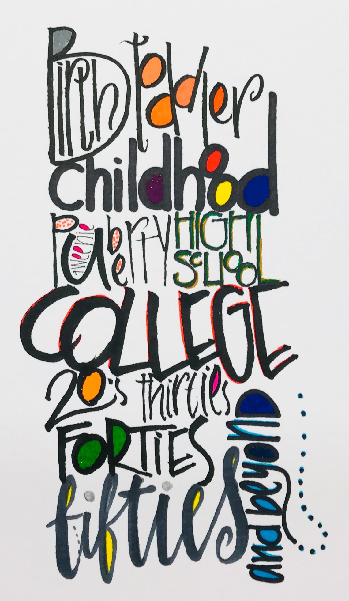 This week’s calligraphy prompt was to show the group your favorite season. When I read the word season I did not automatically think of Summer, Winter, etc. I thought about the seasons of life. I made the mistake of looking at the submissions from other people in the group and I tried hard – I made two options – using the traditional seasons of nature. I didn’t like either of them. I slept on it and decided to go back to my original thought about the seasons of life. I decided to use a variety of black markers and fill in with other colors.