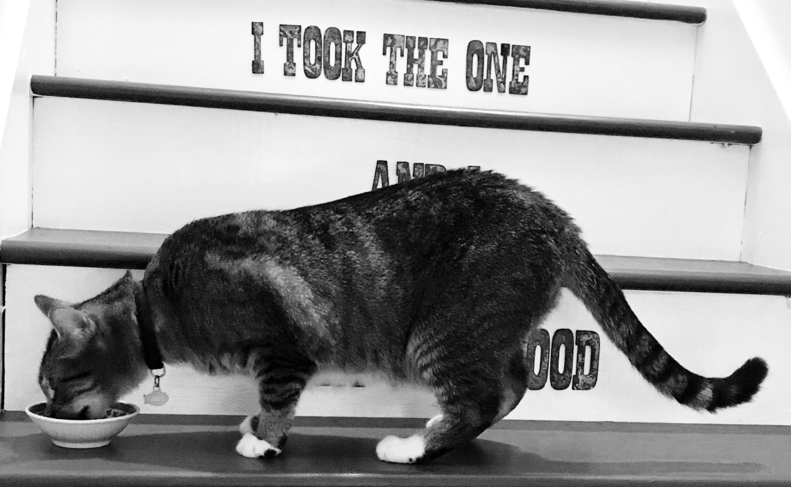 Teaching Buschi a new routine reminded me of how hard it is when things change. I had to come up with a new idea, he had to see it work, and the puppies had to resist the temptation to do a bad thing and climb the stairs. Everyone had to change. If any of us goes back to how it used to be or alters the way things are working, everything goes wrong and treats do not get consumed by the feline.