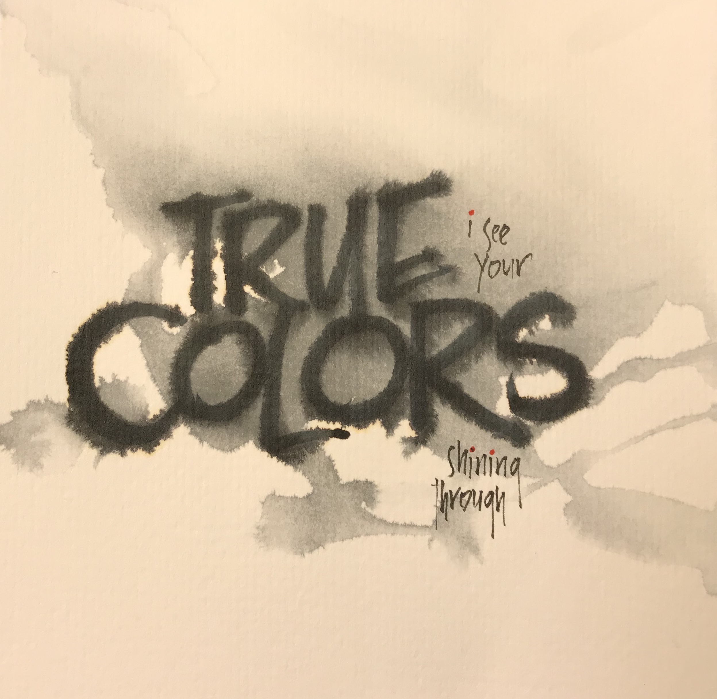 After a bit of thinking I realized I wanted to know more about how black Sumi ink reacts with water, so I changed directions. I wrote the main words using Sumi ink with a brush on watercolor paper. I then ran the entire piece under the faucet to see how the ink would react to running water. I ended up creating three versions, this is the one I liked best. The smaller words are also Sumi ink, written two days later after the large letters and water/ink had time to dry. The red is gel pen. I like the way the water blended with the ink around the edges of certain letters and how the ink spread into uncontrollable spaces.