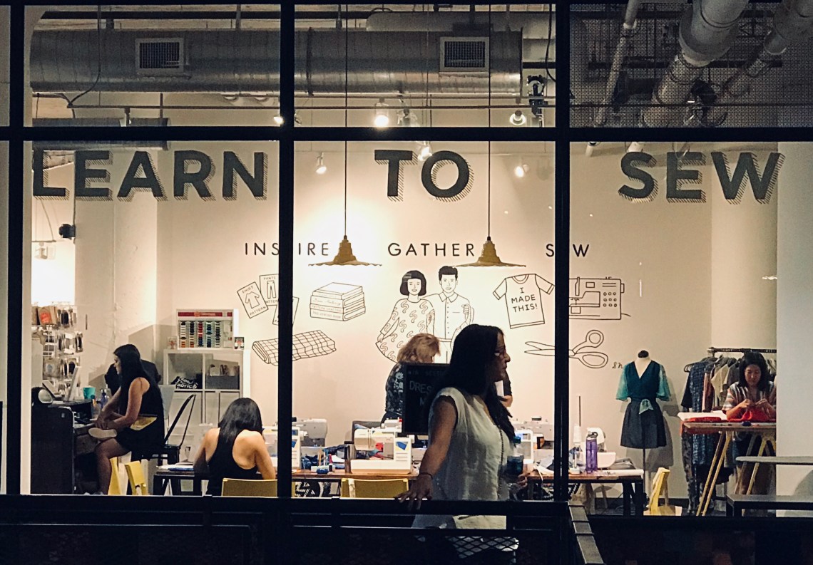 We visited Ponce City Market today and this business was new since our last visit. It is a place where you can learn to sew. They have classes, workshops and all sorts of patterns. Right there for everyone to see were people learning new things and creating beautiful clothes. I watched as people walked by and others looked in the windows to see what was going on inside. I thought it was pretty darn cool that this had such a big presence and seemed to be busy.