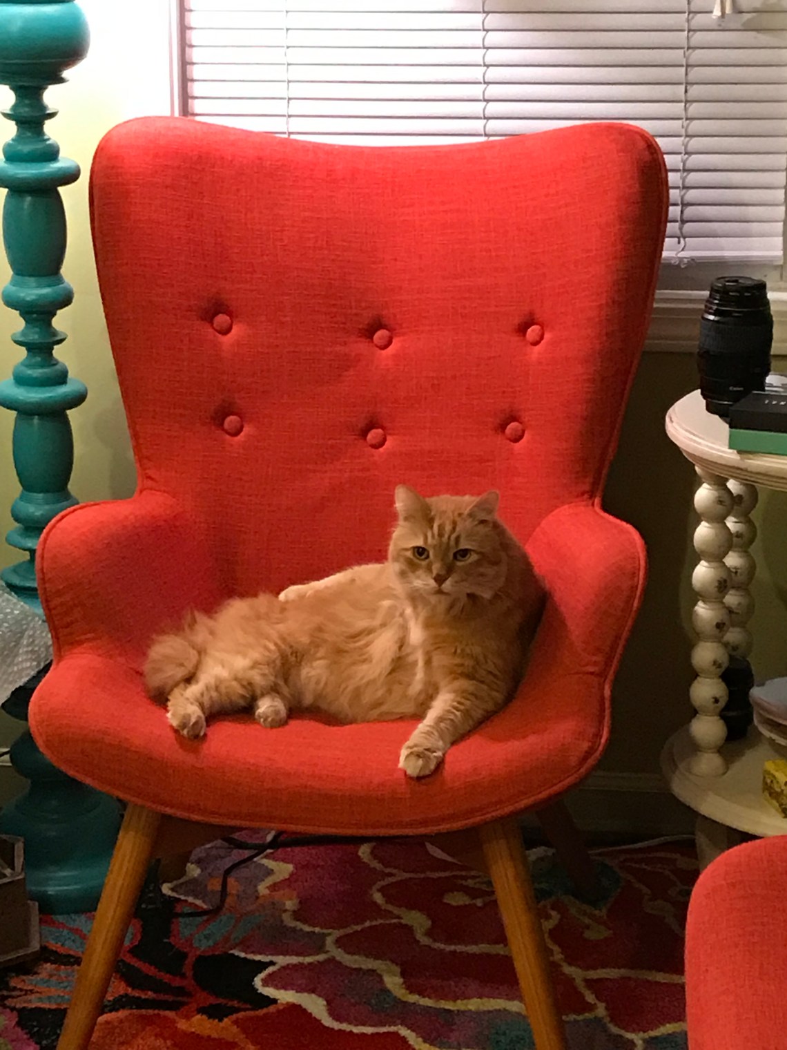 This is Tigger, a dear friend’s cat. He loves this chair in her studio and has commandeered it as his own. He takes naps here, rests here, and generally keeps his eye on the room to stay on top of what people are doing. If he is not there you can sit there, and he will let you know when he wants it back and expects you to vacate.