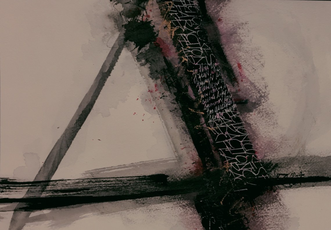 I went back to class after dinner and stayed late hoping to finish my day’s projects. I focused on this piece and made a HUGE mistake. I then tried to repair it by adding more ink, then the white letters over it all. I left very discouraged and had decided to ask my teacher to use my piece as an example of how to correct errors using Gesso. I was the first to arrive in class the next morning and told my teacher about the piece. She went over to my desk and held up this piece and asked if this was the one I thought I had overworked. I said yes, and she totally disagreed. She said it was a great example of what she was trying to get us to do – texture movement, layers and in my case demonstrate the emotion of fear. Who knew, what I thought was ruined she thought was perfection…go figure!