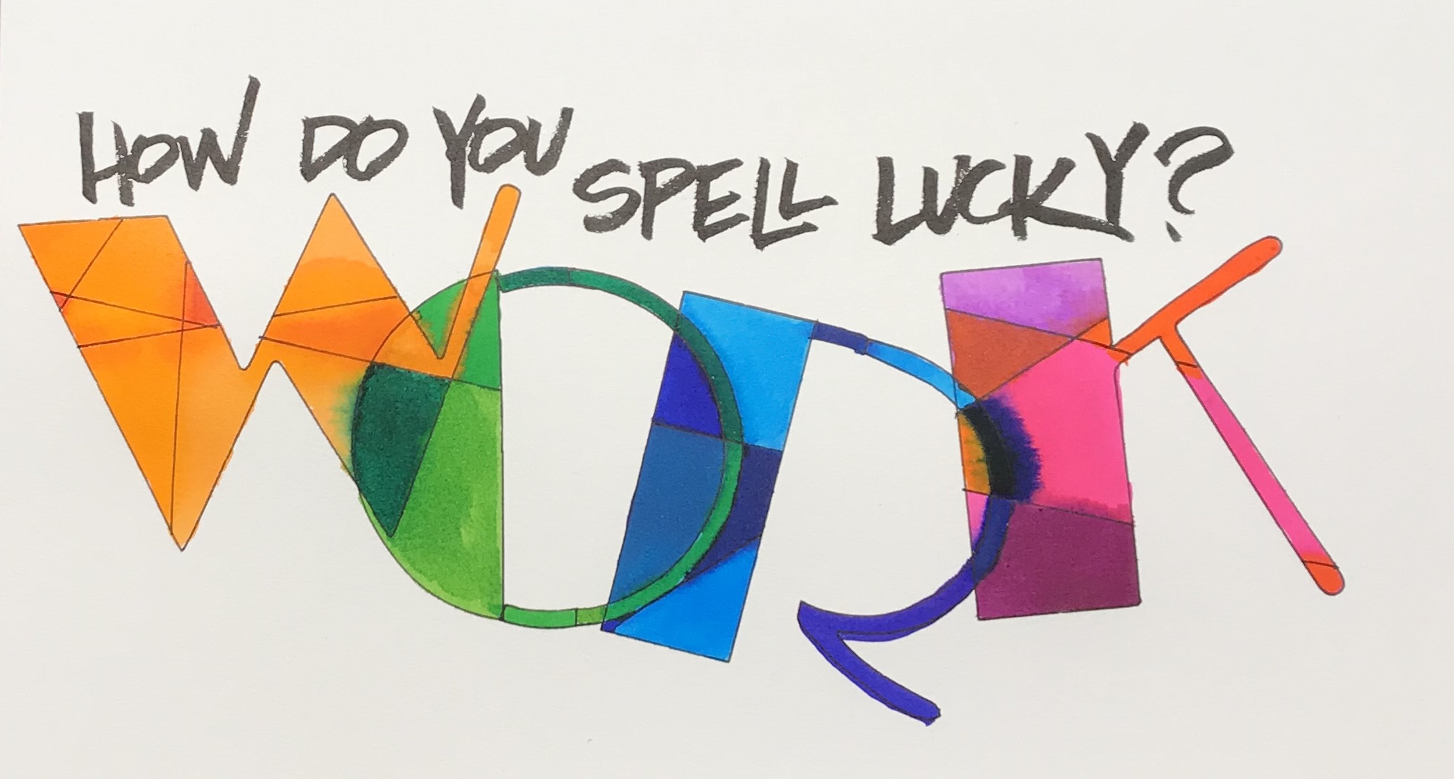 In this 27th week of our challenge we were given the concept of luck for a prompt. What does luck mean to us? What do we feel lucky about? Why are we lucky? Of course all the typical thoughts came to mind – shamrocks, green, gambling and even lucky in love. As I thought about it I realized I do not believe in luck, other than in card games. Most people that I know who are thought to be lucky got what they have through hard work over a long period of time. So I decided to write this phrase. Pentel ink brush pens on mixed media paper.