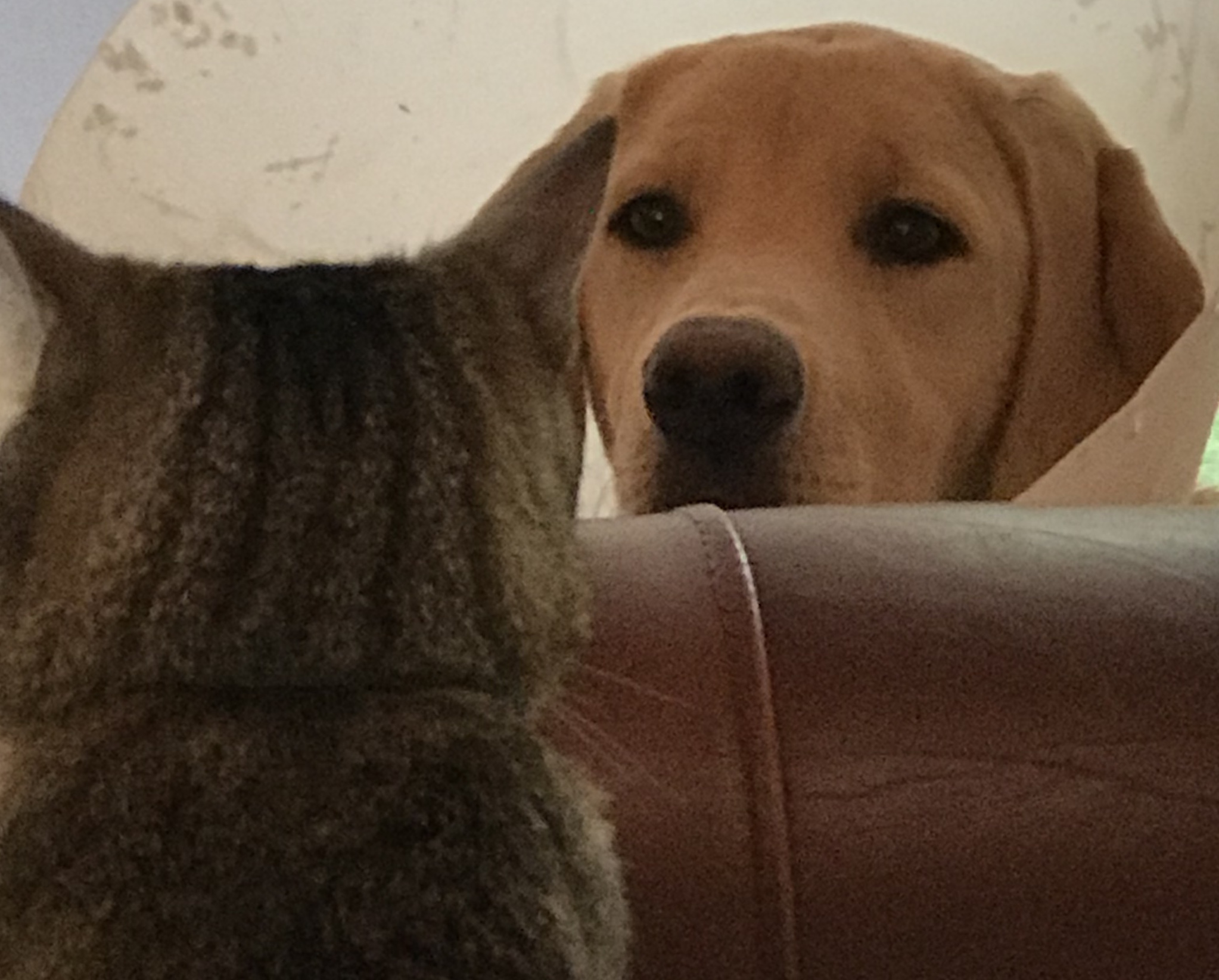 When our puppies arrived the cat didn’t know what to do about it. He was smaller, more fragile and those darn dogs seemed to be everywhere. Every time he turned around there was a puppy following him, and as time passed those canine creatures got bigger and bigger. Buschi has realized over the past few months that the dogs are here to stay. So he either had to spend his time under a bed feeling safe or he had to face his fear.