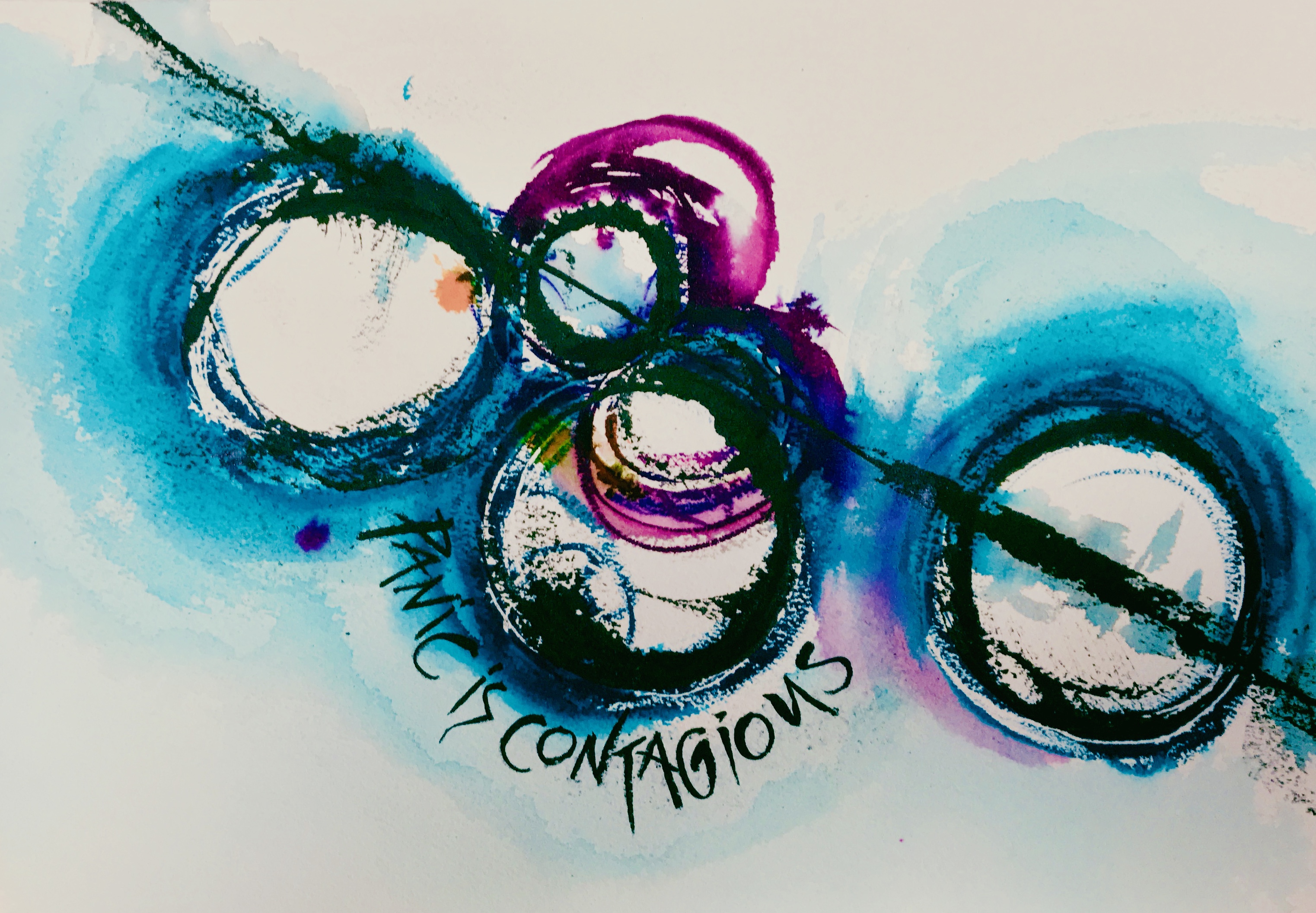 First step, draw the black circles and line. Second step, add the color. In this case it was Pentel brush pens. I added resist to the outside of the circles after the Sumi ink was dry, that way the ink would have empty spaces within and around the dark circles. Third step, create movement or energy within the piece by spreading or smearing the inks and colors. Final step, add words. I liked the way the purple was concentrated in the center then began to bleed into the circle on the right…sort of like panic, no matter how hard we try it is contagious.