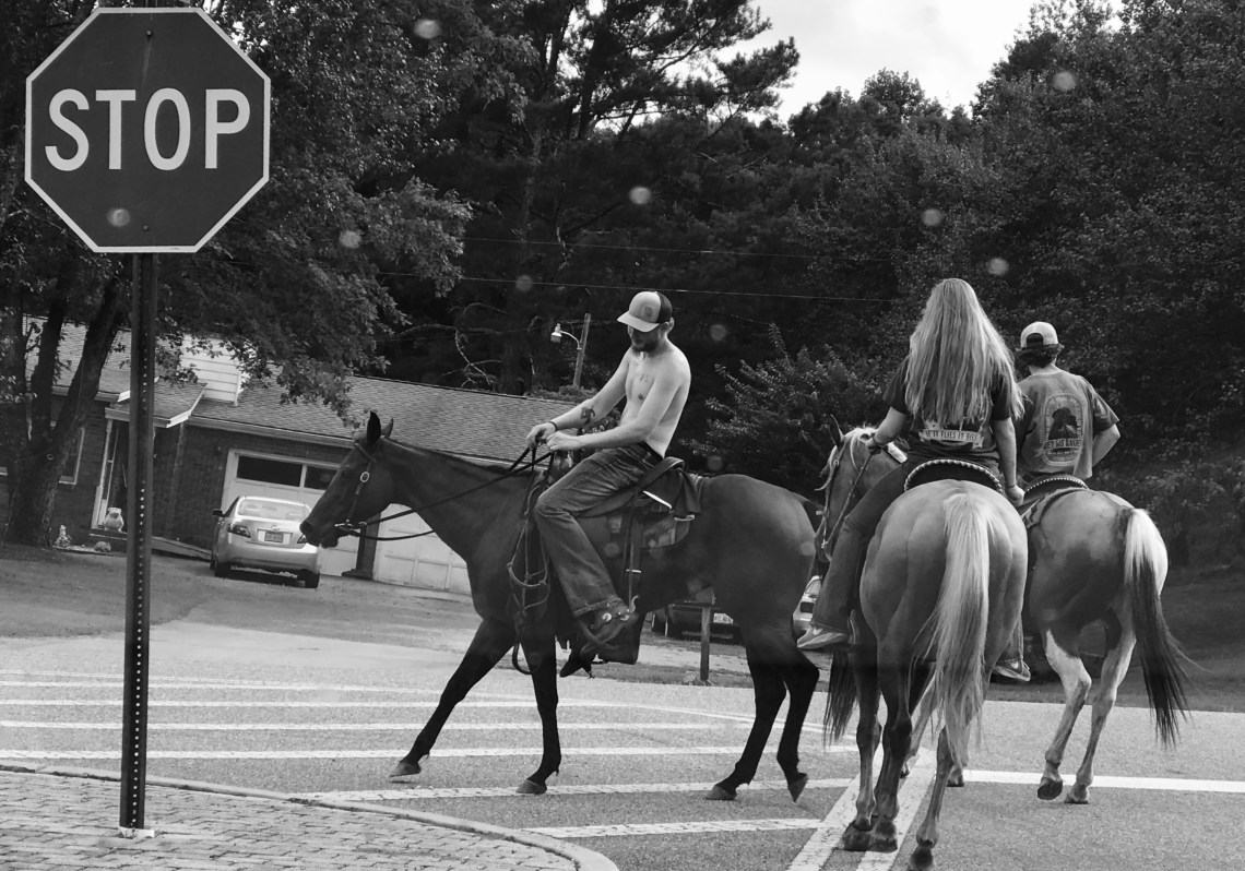 We had to wait behind some of our neighbors at a stop sign. A few rain drops were beginning to fall and the horses were in no hurry to get across the road. Once they crossed the road they went straight for the grass and a softer place to stroll. Just another fun Friday night roaming the neighborhood at the end of a warm summer day.