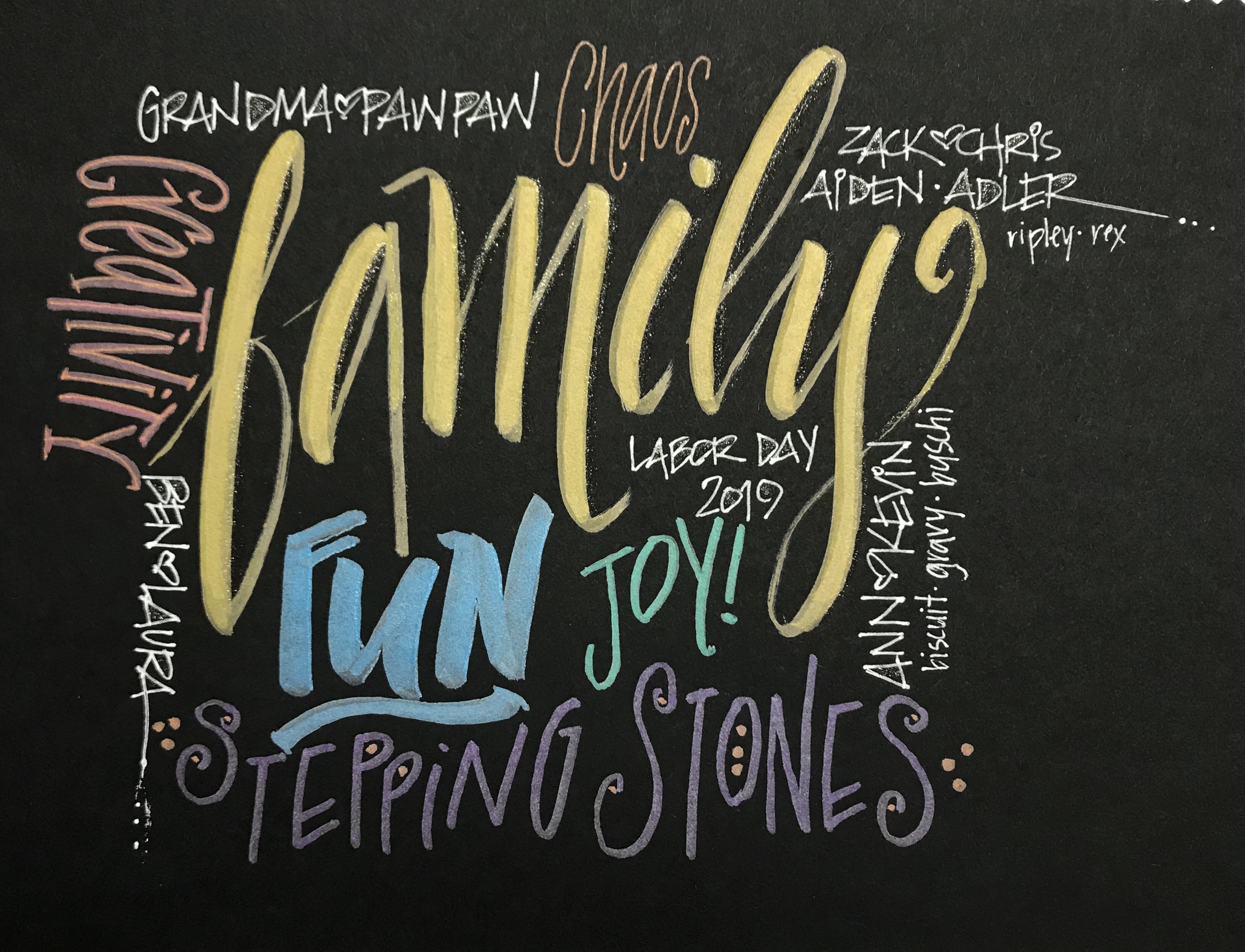 This is the 35th week of our calligraphy challenge and the prompt was to create a word collage using the same word, different words and or different lettering styles. I have done a couple of these in the past and wanted to do a different topic. We had family here for Labor Day weekend – ten people, four dogs, one cat – and we had a blast. We made stepping stones, roasted marshmallows over a fire pit and told lots of funny stories. It was a great weekend and that is what I utilized as my word collage. I used various metallic pens, a white gel pen and Wink of Stella on Artagain black paper.