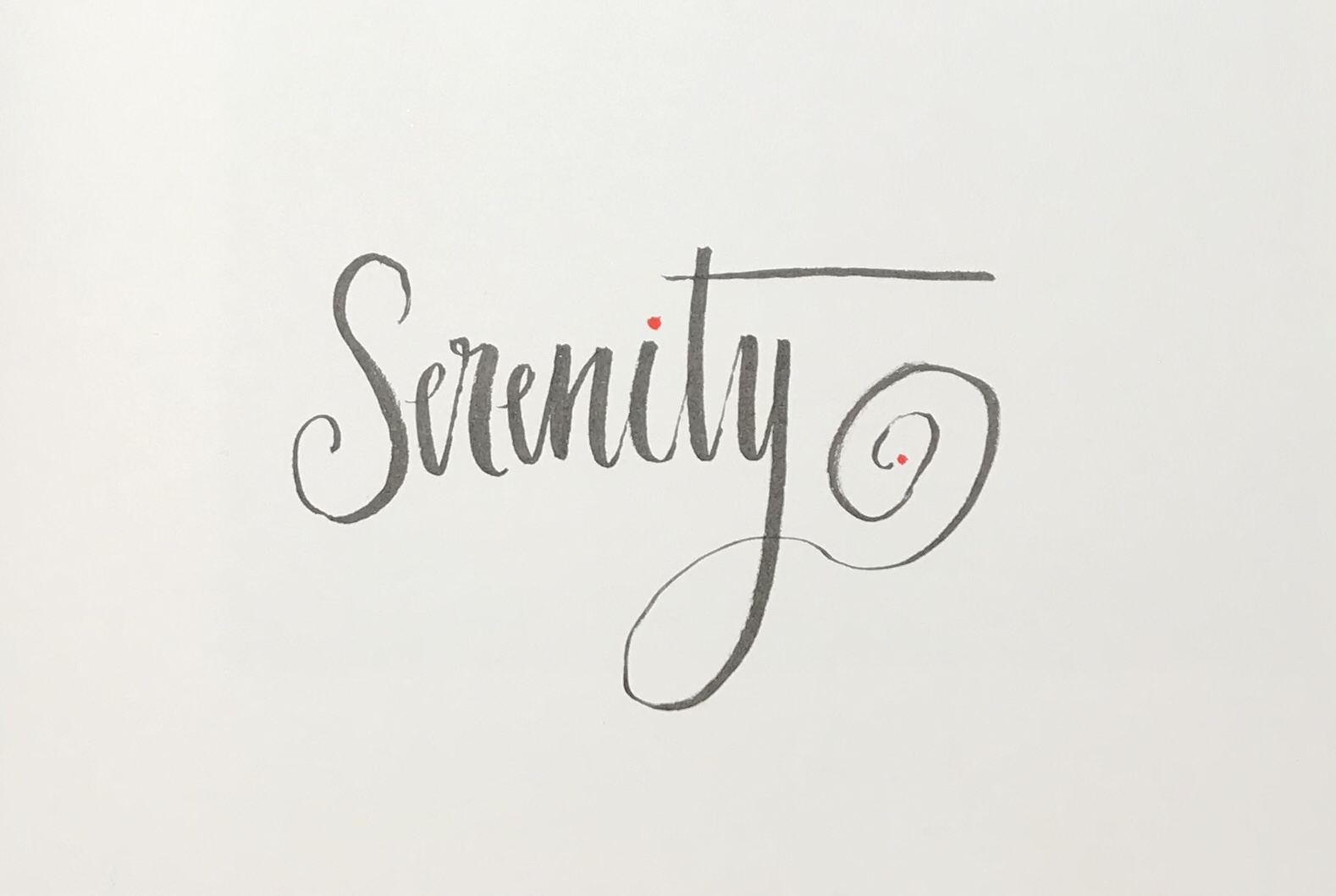 It is the 37th week of our fifty week calligraphy challenge, and the prompt was ‘serenity’. I will be traveling a great deal this month so I completed this simple one in my hotel room. Sometimes simple is the best way to get your point across. I utilized Sumi ink, brushes on mixed media paper.
