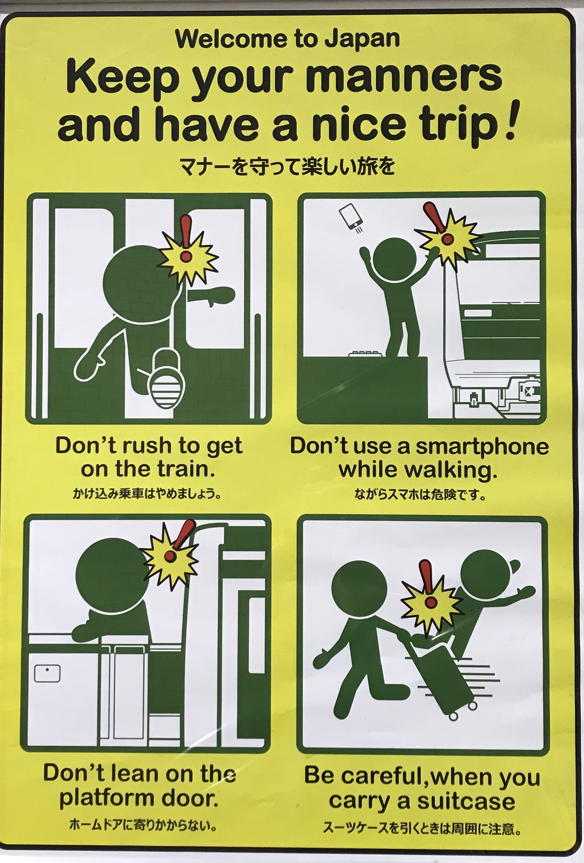 Japan is getting ready to host the 2020 Olympics. This sign greeted us at the Koriyama train station. When you read the pointers it sounds like common sense, but common sense does not guarantee common practice so the Japanese choose to remind everyone of expected behaviors.