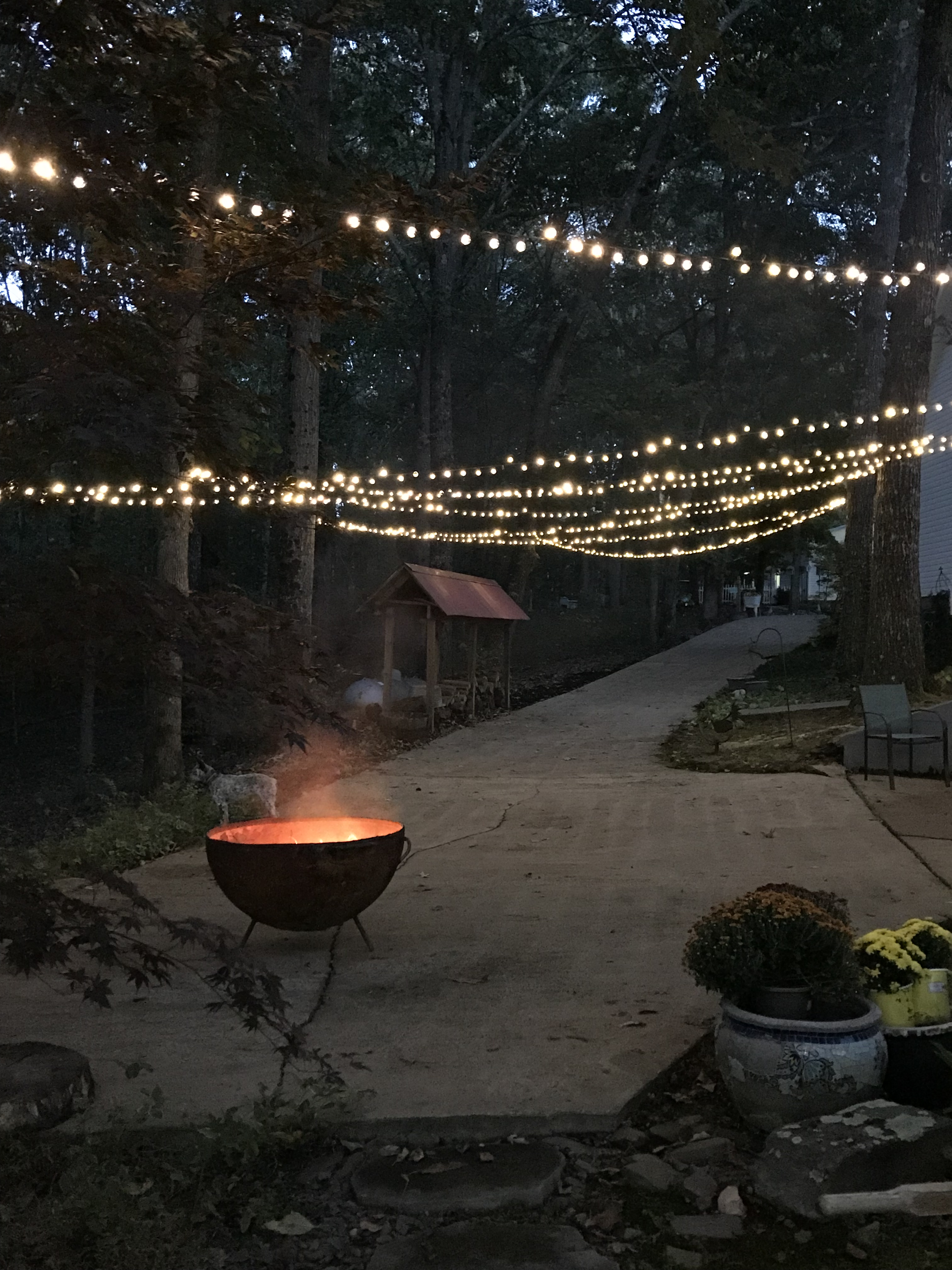 We’re getting ready for a wedding this weekend, so we spent part of the day putting up twinkle lights. What a difference a little light can do for a place. As the sun set we all spent time coming in and out of the house to admire the lights. Young and old were mesmerized by the transformation, and my twelve year old great nephew said he thought the light made everything look bigger and better. Between the twinkle lights and burning twigs in the fire pit the time we spent working hard and cleaning up was a blast?