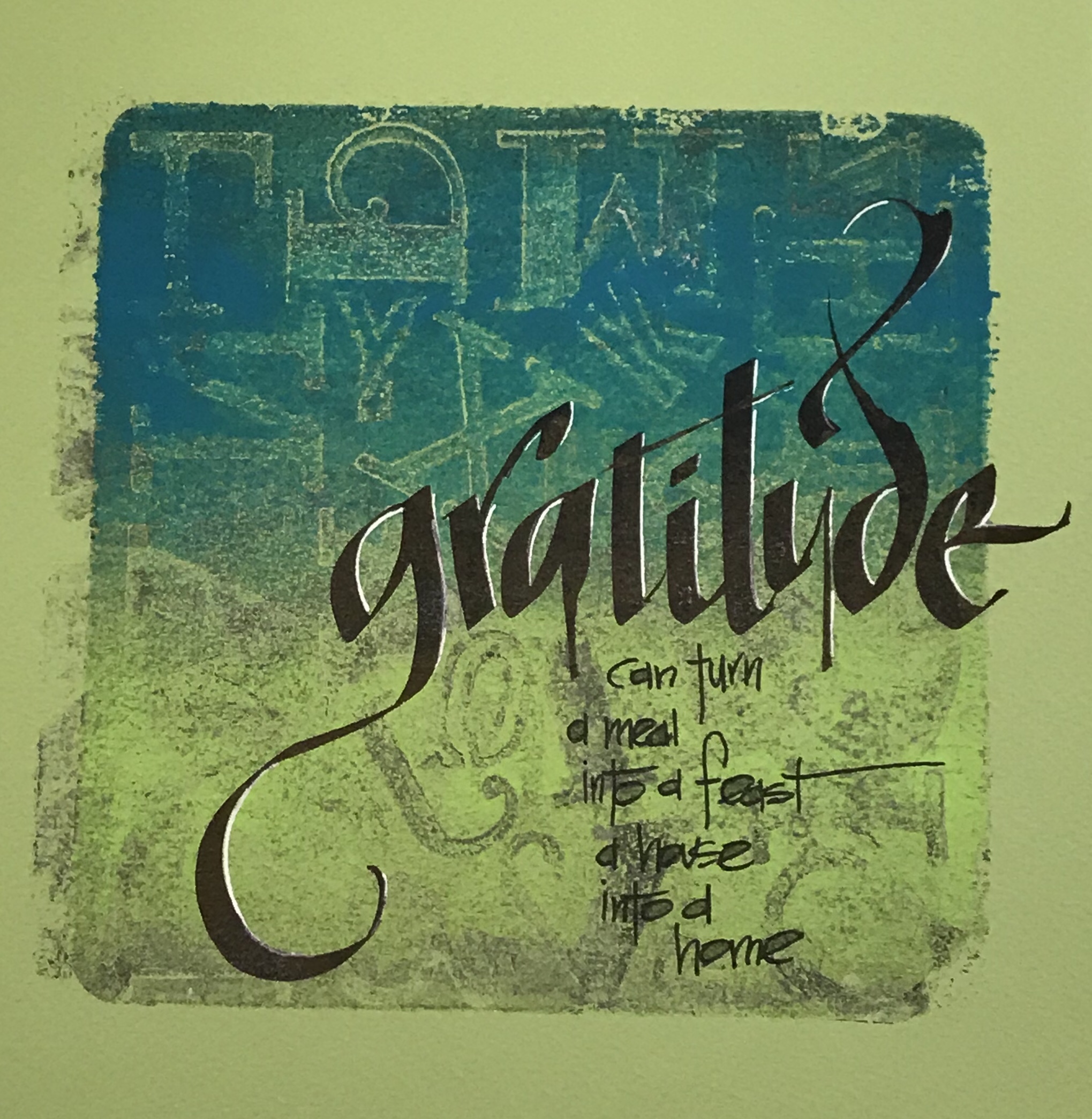 We are in week forty-eight of our Calligraphy challenge and the prompt was ‘gratitude changes everything’. I have a favorite saying that highlights this concept so I chose those words. I created a gel print using a wood stamp I made on Canson paper. The words gratitude was written with a parallel 6.0 highlighted with white gel pen. The smaller words were written with a micron 1 then filled in with a gray sharpie. I’m very pleased with the way this one turned out.