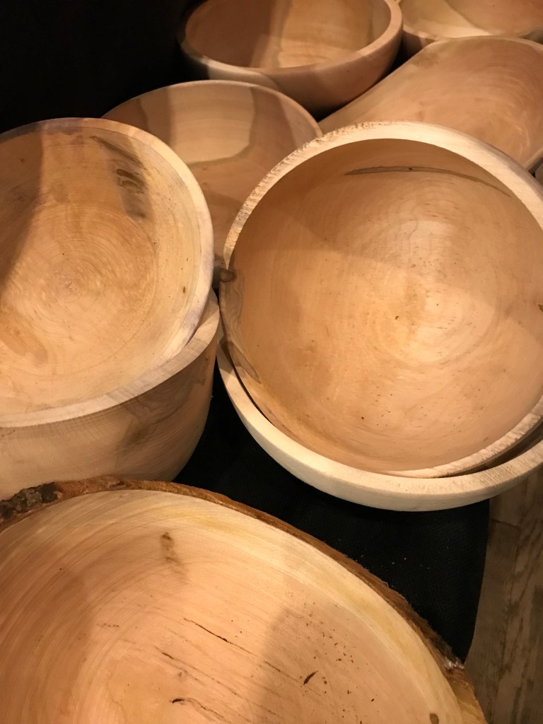 These bowls were turned by a beginning wood working class. During the week each student turned at least 25-30 bowls. Each bowl provided an opportunity to practice, learn and improve their skills and techniques. At the end of the week the class was asked to show the school their best work. Having created an abundance of bowls each student had multiple options to share with everyone.